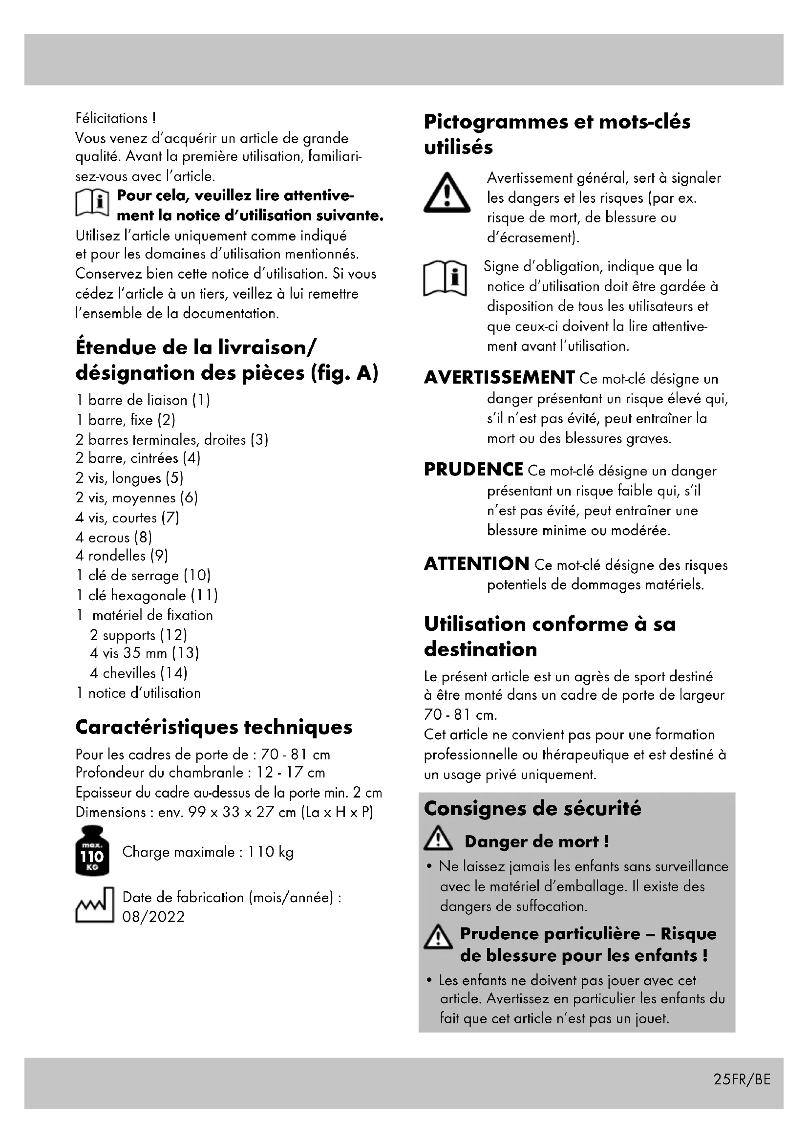 Charge maximale : 110 kg Date de fabrication (mois/année) : 08/2022 Pictogrammes et mots-clés utilisés Avertissement général, sert à signaler les dangers et les risques (par ex. risque de mort, de blessure ou d’écrasement). Signe d’obligation, indique que la notice d’utilisation doit être gardée à disposition de tous les utilisateurs et que ceux-ci doivent la lire attentive- ment avant l’utilisation. AVERTISSEMENT Ce mot-clé désigne un danger présentant un risque élevé qui, s’il n’est pas évité, peut entraîner la mort ou des blessures graves. PRUDENCE Ce mot-clé désigne un danger présentant un risque faible qui, s’il n’est pas évité, peut entraîner une blessure minime ou modérée. ATTENTION Ce mot-clé désigne des risques potentiels de dommages matériels. Utilisation conforme à sa destination Le présent article est un agrès de sport destiné à être monté dans un cadre de porte de largeur