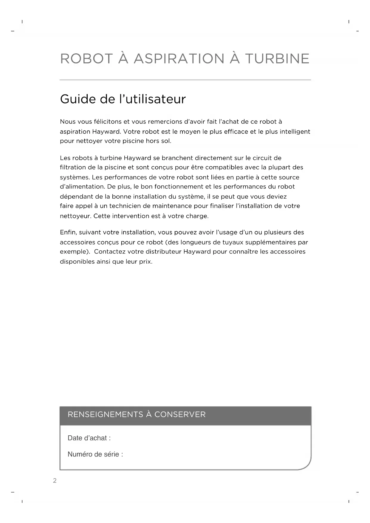 RENSEIGNEMENTS À CONSERVER Guide de l’utilisateur Nous vous félicitons et vous remercions d’avoir fait l’achat de ce robot à aspiration Hayward. Votre robot est le moyen le plus ecace et le plus intelligent pour nettoyer votre piscine hors sol. Les robots à turbine Hayward se branchent directement sur le circuit de filtration de la piscine et sont conçus pour être compatibles avec la plupart des systèmes. Les performances de votre robot sont liées en partie à cette source d’alimentation. De plus, le bon fonctionnement et les performances du robot dépendant de la bonne installation du système, il se peut que vous deviez faire appel à un technicien de maintenance pour finaliser l’installation de votre nettoyeur. Cette intervention est à votre charge. Enfin, suivant votre installation, vous pouvez avoir l’usage d’un ou plusieurs des accessoires conçus pour ce robot (des longueurs de tuyaux supplémentaires par exemple). Contactez votre distributeur Hayward pour connaître les accessoires disponibles ainsi que leur prix. Date d’achat: Numéro de série:3