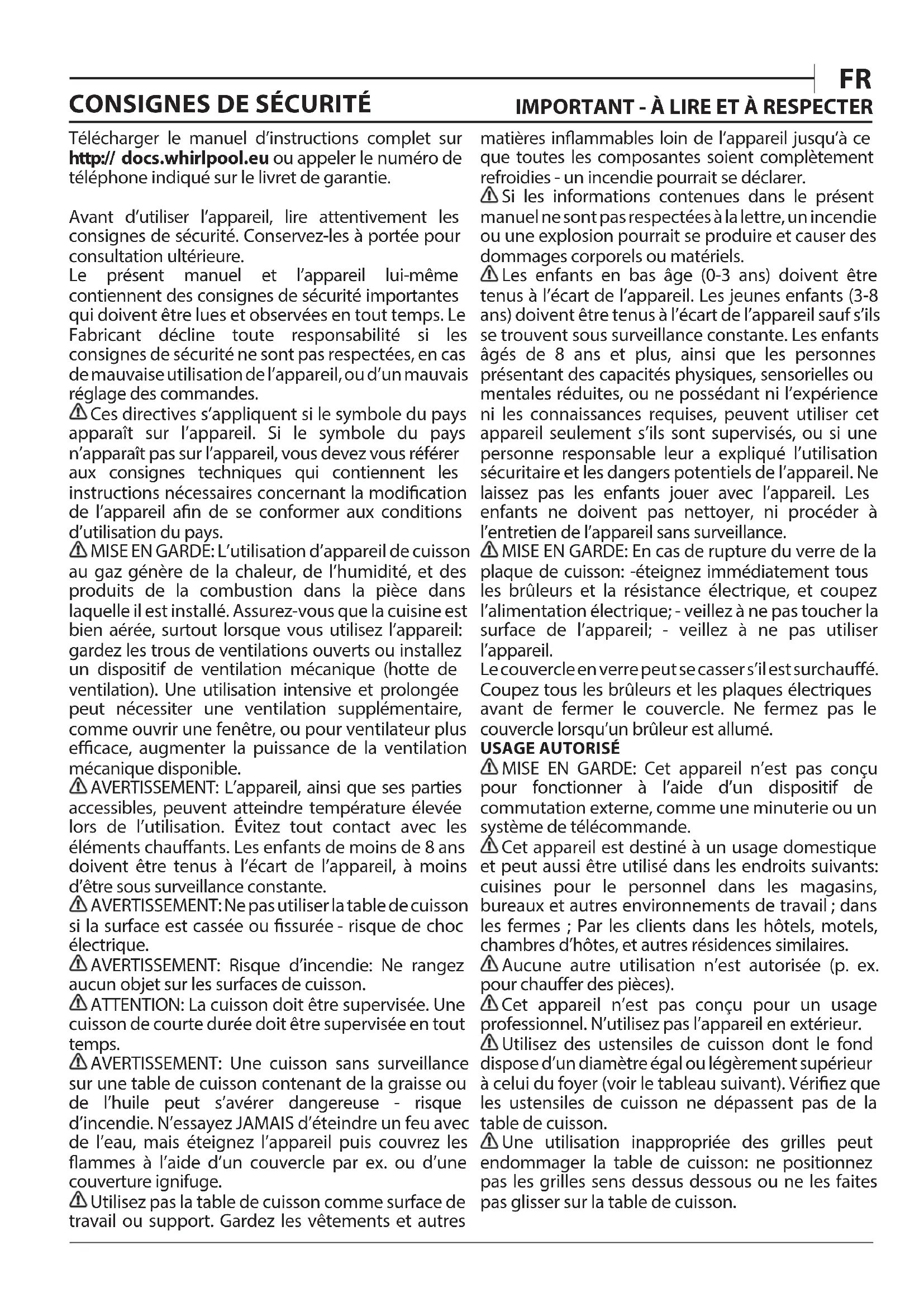 Télécharger le manuel d’instructions complet sur http:// docs . whirlpool . eu ou appeler le numéro de téléphone indiqué sur le livret de garantie. Avant d’utiliser l’appareil, lire attentivement les consignes de sécurité. Conservez-les à portée pour consultation ultérieure. Le présent manuel et l’appareil lui-même contiennent des consignes de sécurité importantes qui doivent être lues et observées en tout temps. Le Fabricant décline toute responsabilité si les consignes de sécurité ne sont pas respectées, en cas de mauvaise utilisation de l’appareil, ou d’un mauvais réglage des commandes. Ces directives s’appliquent si le symbole du pays apparaît sur l’appareil. Si le symbole du pays n’apparaît pas sur l’appareil, vous devez vous référer aux consignes techniques qui contiennent les instructions nécessaires concernant la modication de l’appareil an de se conformer aux conditions d’utilisation du pays. MISE EN GARDE: L’utilisation d’appareil de cuisson au gaz génère de la chaleur, de l’humidité, et des produits de la combustion dans la pièce dans laquelle il est installé. Assurez-vous que la cuisine est bien aérée, surtout lorsque vous utilisez l’appareil: gardez les trous de ventilations ouverts ou installez un dispositif de ventilation mécanique (hotte de ventilation). Une utilisation intensive et prolongée peut nécessiter une ventilation supplémentaire, comme ouvrir une fenêtre, ou pour ventilateur plus ecace, augmenter la puissance de la ventilation mécanique disponible.