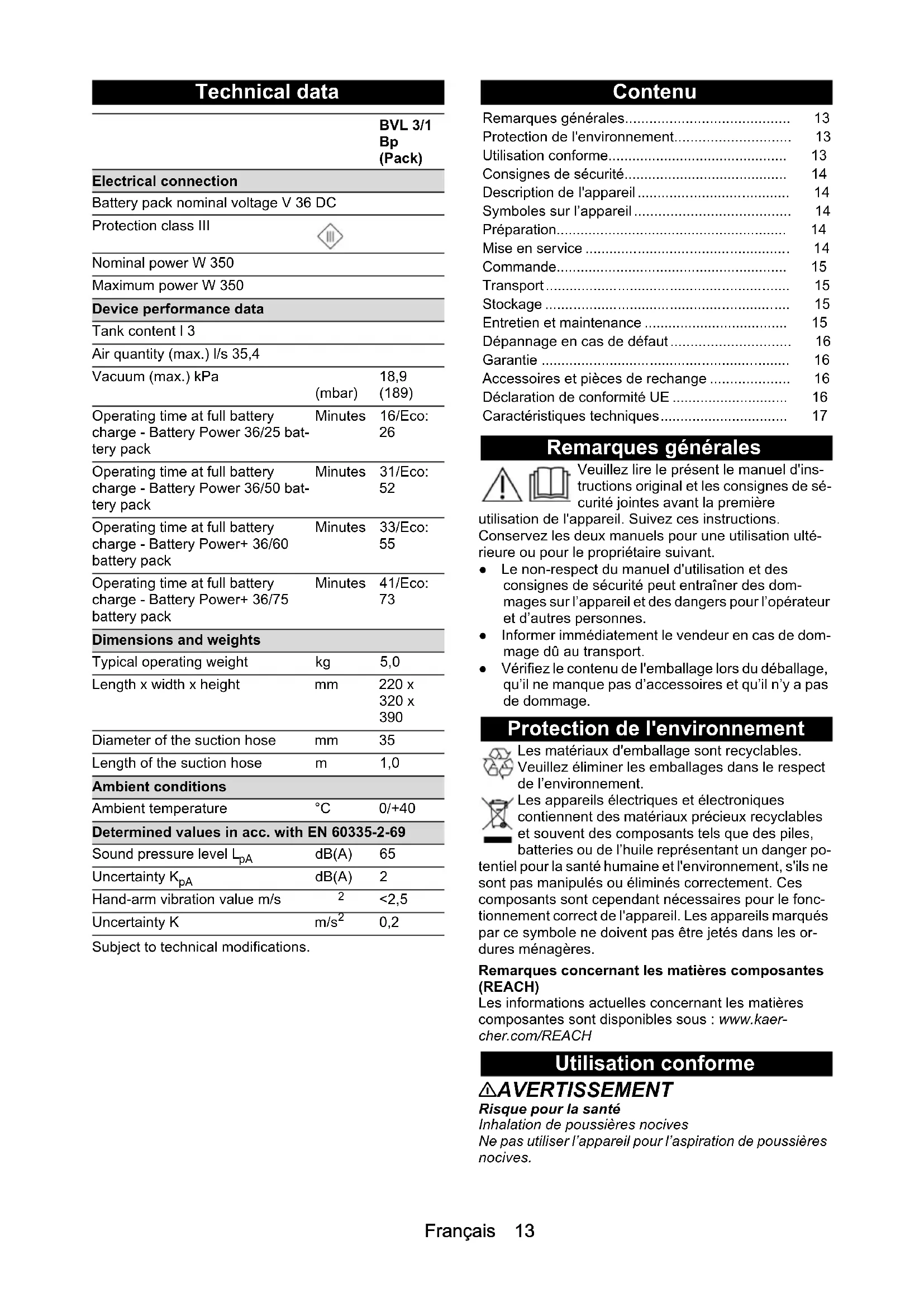 The signatories act on behalf of and with the authority of the company management. Documentation supervisor: S. Reiser Alfred Kärcher SE & Co. KG Alfred-Kärcher-Str. 28 - 40 71364 Winnenden (Germany) Ph.: +49 7195 14-0 Fax: +49 7195 14-2212 Winnenden, 2020/10/01 Description Order num- ber, spare part Item No., unpacked Battery pack Battery Pow- er+ 36/75 2.445-043.0 6.445-059.0 Battery pack Battery Pow- er+ 36/60 2.042-022.0 6.445-085.0 Battery pack Battery Pow- er 36/50 2.445-031.0 6.445-039.0 Battery pack Battery Pow- er 36/25 2.445-030.0 6.445-038.0 Quick charger Battery Power+ 36/60 (EU) 2.445-045.0 6.445-063.0 Quick charger Battery Power+ 36/60 (GB) 2.445-047.0 6.445-065.0 Quick charger Battery Power+ 36/60 (AU) 2.445-051.0 6.445-069.0 EU Declaration of Conformity Declaration of Conformity (UK)Français 13 Technical data Subject to technical modifications. Contenu Remarques générales Veuillez lire le présent le manuel d'ins- tructions original et les consignes de sé- curité jointes avant la première utilisation de l'appareil. Suivez ces instructions. Conservez les deux manuels pour une utilisation ulté- rieure ou pour le propriétaire suivant. ● Le non-respect du manuel d'utilisation et des consignes de sécurité peut entraîner des dom- mages sur l’appareil et des dangers pour l’opérateur et d’autres personnes. ● Informer immédiatement le vendeur en cas de dom- mage dû au transport. ● Vérifiez le contenu de l'emballage lors du déballage, qu’il ne manque pas d’accessoires et qu’il n’y a pas de dommage. Protection de l'environnement Les matériaux d'emballage sont recyclables. Veuillez éliminer les emballages dans le respect de l’environnement. Les appareils électriques et électroniques contiennent des matériaux précieux recyclables et souvent des composants tels que des piles, batteries ou de l’huile représentant un danger po- tentiel pour la santé humaine et l'environnement, s'ils ne sont pas manipulés ou éliminés correctement. Ces composants sont cependant nécessaires pour le fonc- tionnement correct de l'appareil. Les appareils marqués par ce symbole ne doivent pas être jetés dans les or- dures ménagères. Remarques concernant les matières composantes (REACH) Les informations actuelles concernant les matières composantes sont disponibles sous : www.kaer- cher.com/REACH Utilisation conforme 몇 AVERTISSEMENT Risque pour la santé Inhalation de poussières nocives Ne pas utiliser l’appareil pour l’aspiration de poussières nocives. BVL 3/1