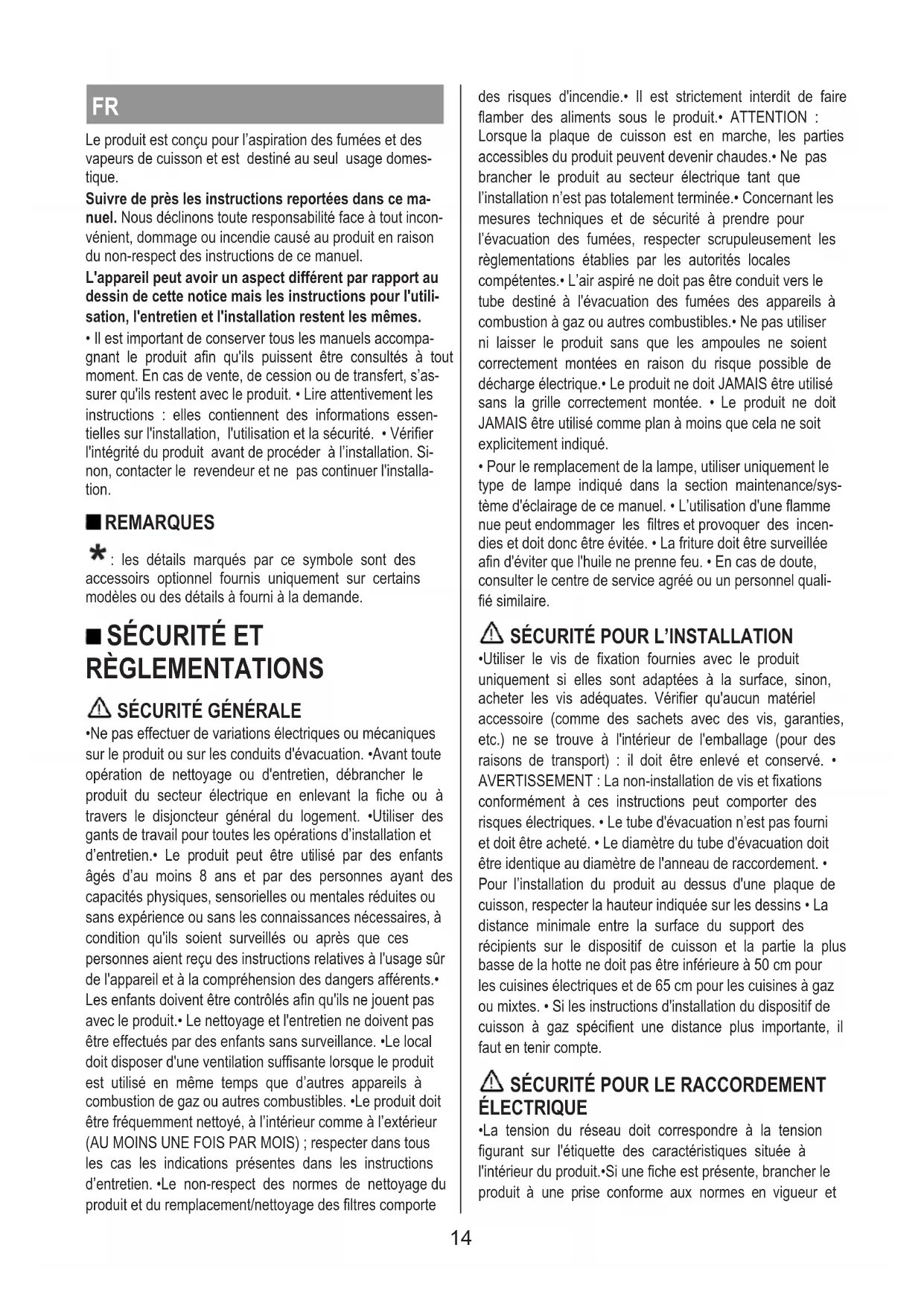 - Ne pas effectuer de variations électriques ou mécaniques sur le produit ou sur les conduits d'évacuation. •Avant toute opération de nettoyage ou d'entretien, débrancher le produit du secteur électrique en enlevant la fiche ou à travers le disjoncteur général du logement. •Utiliser des gants de travail pour toutes les opérations d’installation et d’entretien.• Le produit peut être utilisé par des enfants âgés d’au moins 8 ans et par des personnes ayant des capacités physiques, sensorielles ou mentales réduites ou sans expérience ou sans les connaissances nécessaires, à condition qu'ils soient surveillés ou après que ces personnes aient reçu des instructions relatives à l'usage sûr de l'appareil et à la compréhension des dangers afférents.• Les enfants doivent être contrôlés afin qu'ils ne jouent pas avec le produit.• Le nettoyage et l'entretien ne doivent pas être effectués par des enfants sans surveillance. •Le local doit disposer d'une ventilation suffisante lorsque le produit est utilisé en même temps que d’autres appareils à combustion de gaz ou autres combustibles. •Le produit doit être fréquemment nettoyé, à l’intérieur comme à l’extérieur (AU MOINS UNE FOIS PAR MOIS); respecter dans tous les cas les indications présentes dans les instructions d’entretien. •Le non-respect des normes de nettoyage du produit et du remplacement/nettoyage des filtres comporte des risques d'incendie.• Il est strictement interdit de faire flamber des aliments sous le produit.• ATTENTION : Lorsque la plaque de cuisson est en marche, les parties accessibles du produit peuvent devenir chaudes.• Ne pas brancher le produit au secteur électrique tant que l’installation n’est pas totalement terminée.• Concernant les mesures techniques et de sécurité à prendre pour l’évacuation des fumées, respecter scrupuleusement les règlementations établies par les autorités locales compétentes.• L’air aspiré ne doit pas être conduit vers le tube destiné à l'évacuation des fumées des appareils à combustion à gaz ou autres combustibles.• Ne pas utiliser ni laisser le produit sans que les ampoules ne soient correctement montées en raison du risque possible de décharge électrique.• Le produit ne doit JAMAIS être utilisé sans la grille correctement montée. • Le produit ne doit JAMAIS être utilisé comme plan à moins que cela ne soit explicitement indiqué.