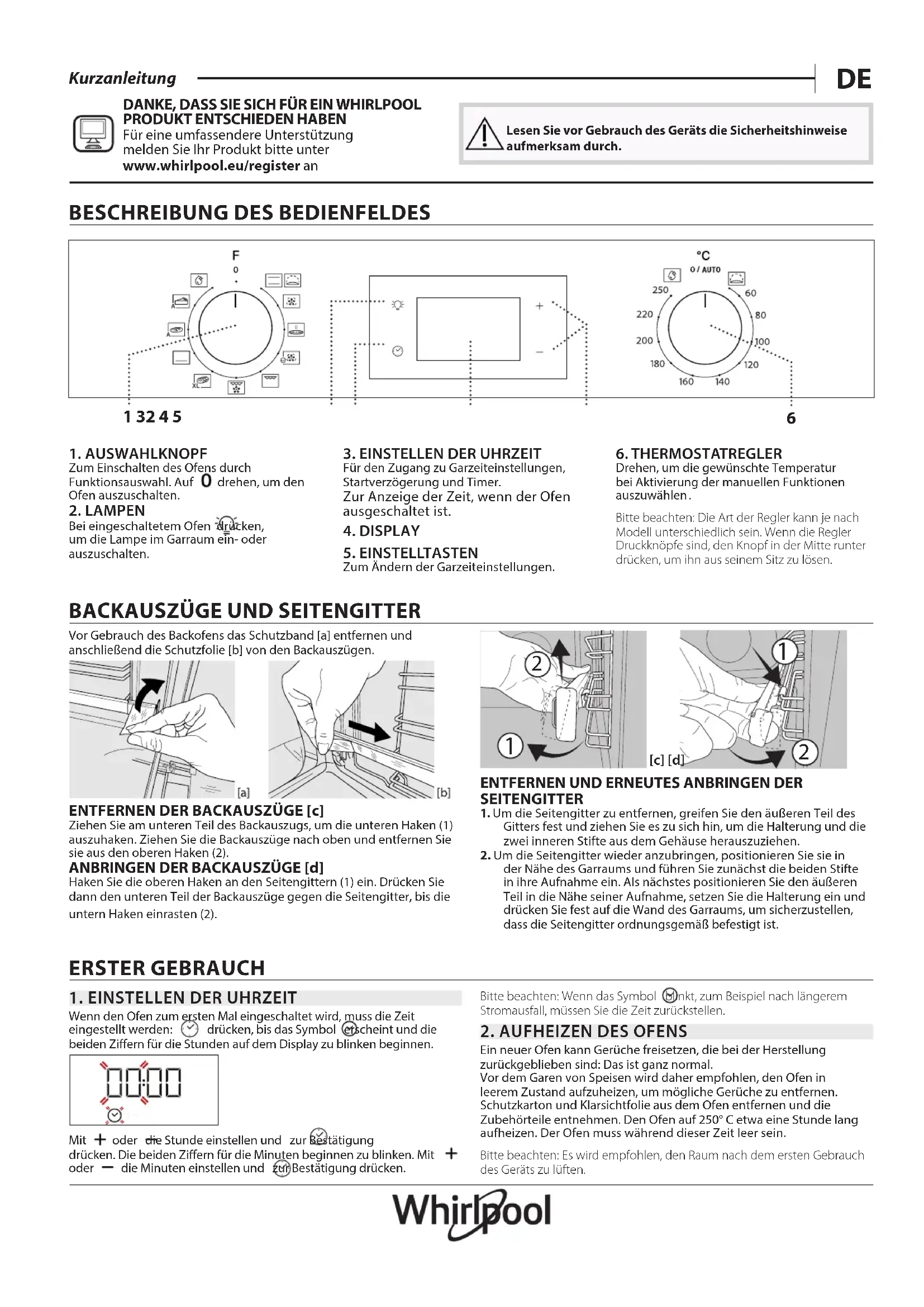 [c] [d]ENLEVER ET REPLACER LES SUPPORTS DE GRILLE1. Pour enlever les supports de grille, agrippez fermement la partie externe du support et tirez-le vers vous pour sortir le support et les deux goupilles internes de leur appui.2. Pour replacer les supports de grille, placez-les près de la cavité et insérez en premier les deux goupilles dans leur appui. Ensuite, placez la partie externe près de son appui, insérez le support, et appuyez fermement vers la paroi pour s’assurer que le support est bien inséré.PREMIÈRE UTILISATION1. RÉGLAGE DE L’HEUREVous devez régler l'heure lorsque vous allumez l'appareil pour la première fois: Appuyez sur jusqu'à ce que le voyant et les deux chires indiquant l'heure clignotent à l'écran.Utilisez ou pour régler l’heure et appuyez sur pour conrmer. Les deux chires des minutes clignotent. Utilisez pour régler les minutes et appuyez sur pour conrmer.Remarque: Lorsque le voyant clignote (par exemple après des pannes de courant prolongées), vous devrez régler l’heure de nouveau.2. CHAUFFER LE FOURUn nouveau four peut dégager des odeurs provenant de la fabrication: ceci est parfaitement normale.Avant de cuire des aliments, nous vous conseillons de chauer le four à vide pour éliminer les odeurs. Enlevez le carton de protection ou le lm transparent du four et enlevez les accessoires de l’intérieur. Chauez le four à 250 °C pendant environ une heure. Le four doit être vide durant cette opération.Veuillez noter: Il est recommandé d'aérer la pièce après avoir utilisé l’appareil pour la première fois.DESCRIPTION DU PANNEAU DE COMMANDE1 32 4 5 1. BOUTON DE SÉLECTIONPour allumer le four en sélectionnant une fonction. Tournez sur la position pour couper le four.2. LAMPEAvec le four allumé, appuyez surpour allumer ou éteindre l'ampoule du compartiment du four.3. RÉGLAGE DE L’HEUREPour accéder les réglages pour le temps de cuisson, le départ diéré, et la minuterie.Pour acher l'heure lorsque le four est éteint.4. ÉCRAN5. BOUTONS DE RÉGLAGESPour changer les réglages du temps de cuisson.6. BOUTON THERMOSTATTournez pour sélectionner la température désirée lorsque vous utilisez les fonctions manuelles Veuillez noter: Les types de boutons peuvent varier en fonction du modèle. Si les boutons sont de type bouton-poussoir, appuyez au centre du bouton pour le sortir de son logement.MERCI D’AVOIR CHOISI UN PRODUIT WHIRLPOOLAn de proter d'une assistance complète, veuillez enregistrer votre appareil sur ww w . whirlpool . eu/register Lisez attentivement les consignes de sécurité avant d’utiliser l’appareil.FONCTIONS ET UTILISATION QUOTIDIENNE CONVENTIONNELLE Pour cuire tout type de plat sur une seule grille. LEVÉE Pour aider les pâtes sucrées ou salées à mieux lever. Tournez le bouton du thermostat sur l’icône pour activer cette fonction.