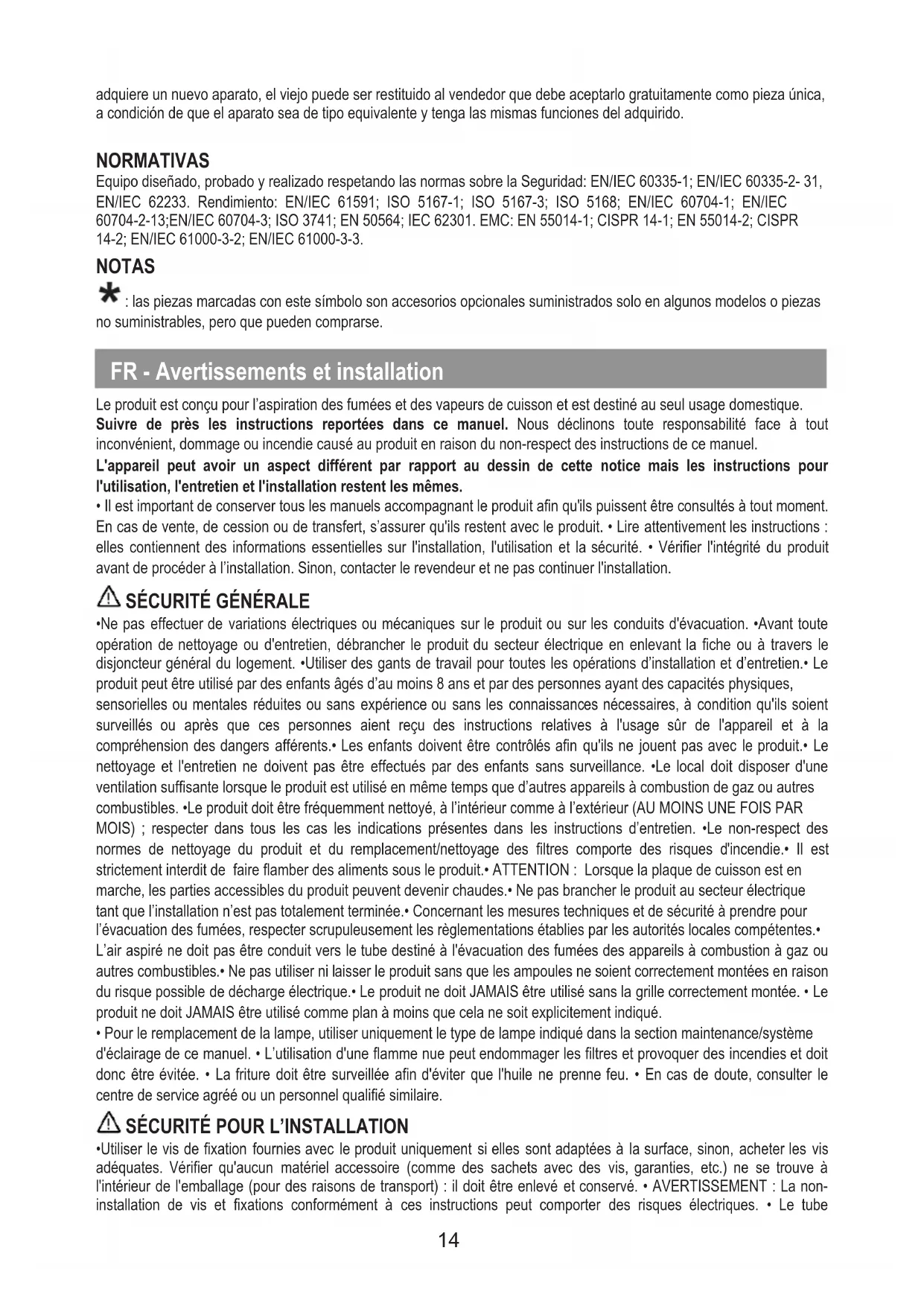 - Ne pas effectuer de variations électriques ou mécaniques sur le produit ou sur les conduits d'évacuation. •Avant toute opération de nettoyage ou d'entretien, débrancher le produit du secteur électrique en enlevant la fiche ou à travers le disjoncteur général du logement. •Utiliser des gants de travail pour toutes les opérations d’installation et d’entretien.• Le produit peut être utilisé par des enfants âgés d’au moins 8 ans et par des personnes ayant des capacités physiques, sensorielles ou mentales réduites ou sans expérience ou sans les connaissances nécessaires, à condition qu'ils soient surveillés ou après que ces personnes aient reçu des instructions relatives à l'usage sûr de l'appareil et à la compréhension des dangers afférents.• Les enfants doivent être contrôlés afin qu'ils ne jouent pas avec le produit.• Le nettoyage et l'entretien ne doivent pas être effectués par des enfants sans surveillance. •Le local doit disposer d'une ventilation suffisante lorsque le produit est utilisé en même temps que d’autres appareils à combustion de gaz ou autres combustibles. •Le produit doit être fréquemment nettoyé, à l’intérieur comme à l’extérieur (AU MOINS UNE FOIS PAR MOIS) ; respecter dans tous les cas les indications présentes dans les instructions d’entretien. •Le non-respect des normes de nettoyage du produit et du remplacement/nettoyage des filtres comporte des risques d'incendie.• Il est strictement interdit de faire flamber des aliments sous le produit.• ATTENTION: Lorsque la plaque de cuisson est en marche, les parties accessibles du produit peuvent devenir chaudes.• Ne pas brancher le produit au secteur électrique tant que l’installation n’est pas totalement terminée.• Concernant les mesures techniques et de sécurité à prendre pour l’évacuation des fumées, respecter scrupuleusement les règlementations établies par les autorités locales compétentes.• L’air aspiré ne doit pas être conduit vers le tube destiné à l'évacuation des fumées des appareils à combustion à gaz ou autres combustibles.• Ne pas utiliser ni laisser le produit sans que les ampoules ne soient correctement montées en raison du risque possible de décharge électrique.• Le produit ne doit JAMAIS être utilisé sans la grille correctement montée. • Le produit ne doit JAMAIS être utilisé comme plan à moins que cela ne soit explicitement indiqué.