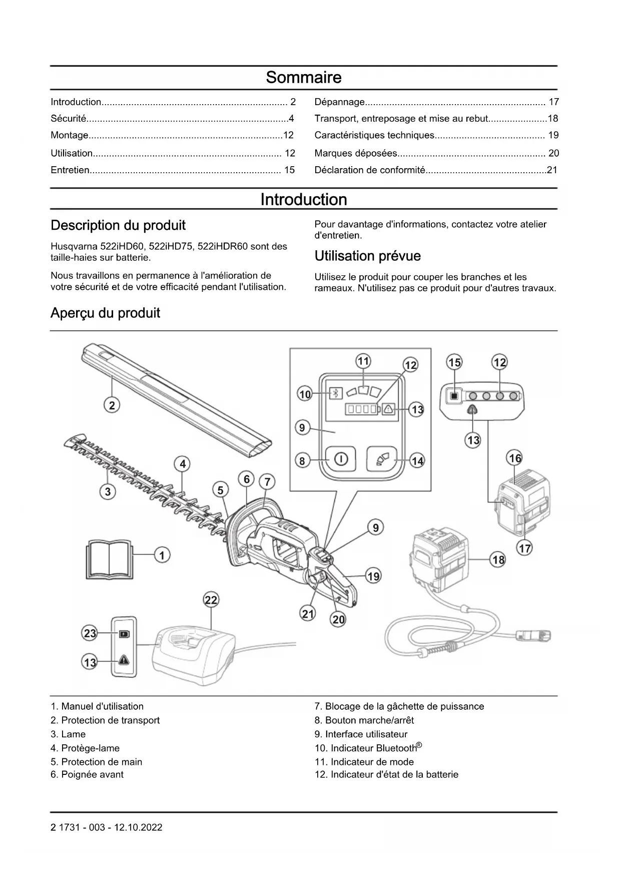 - Déclaration de conformité Introduction Description du produit Husqvarna 522iHD60, 522iHD75, 522iHDR60 sont des taille-haies sur batterie. Nous travaillons en permanence à l'amélioration de votre sécurité et de votre efficacité pendant l'utilisation. Pour davantage d'informations, contactez votre atelier d'entretien. Utilisation prévue Utilisez le produit pour couper les branches et les rameaux. N'utilisez pas ce produit pour d'autres travaux. Aperçu du produit p. 21