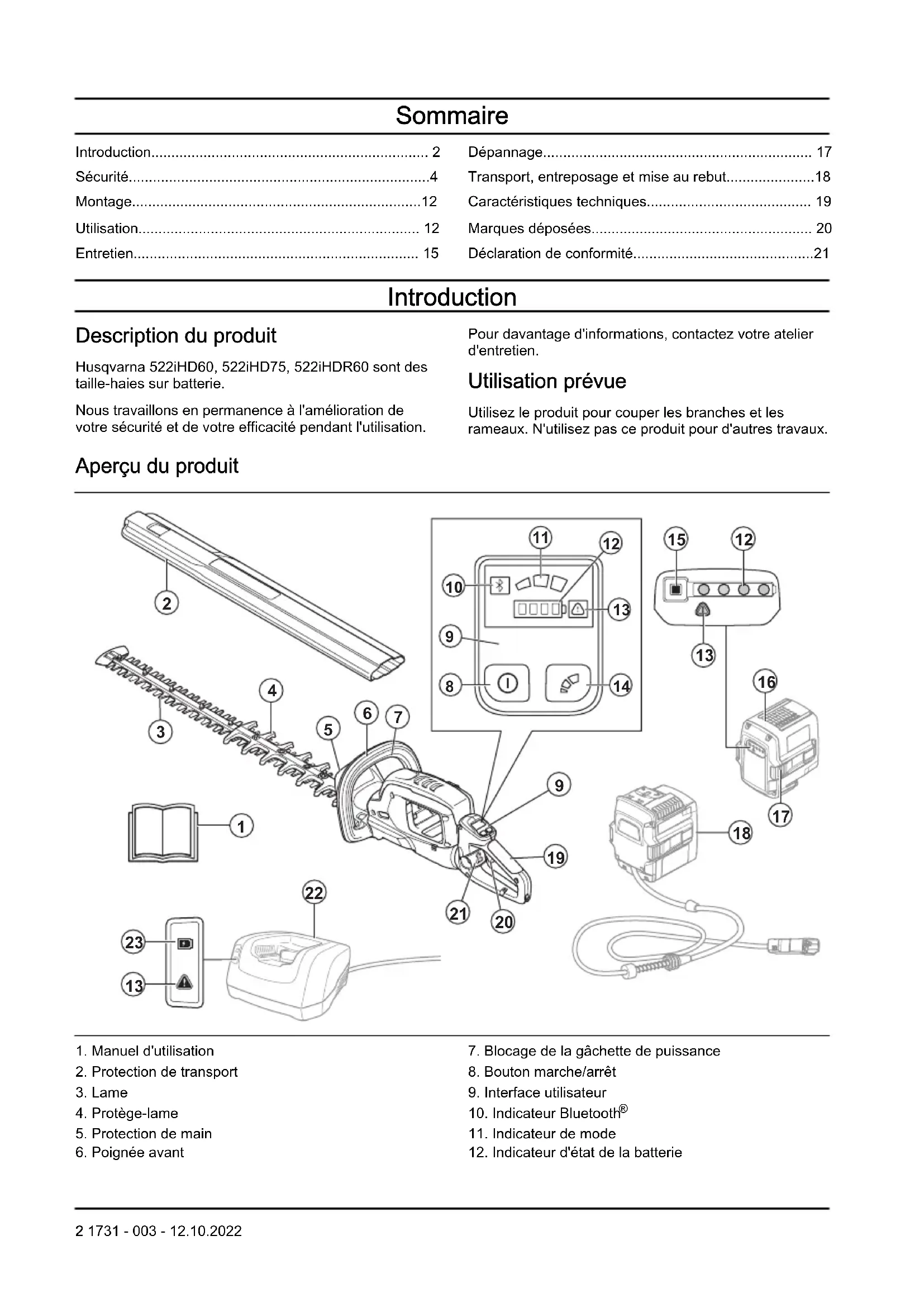 - Déclaration de conformité Introduction Description du produit Husqvarna 522iHD60, 522iHD75, 522iHDR60 sont des taille-haies sur batterie. Nous travaillons en permanence à l'amélioration de votre sécurité et de votre efficacité pendant l'utilisation. Pour davantage d'informations, contactez votre atelier d'entretien. Utilisation prévue Utilisez le produit pour couper les branches et les rameaux. N'utilisez pas ce produit pour d'autres travaux. Aperçu du produit p. 21