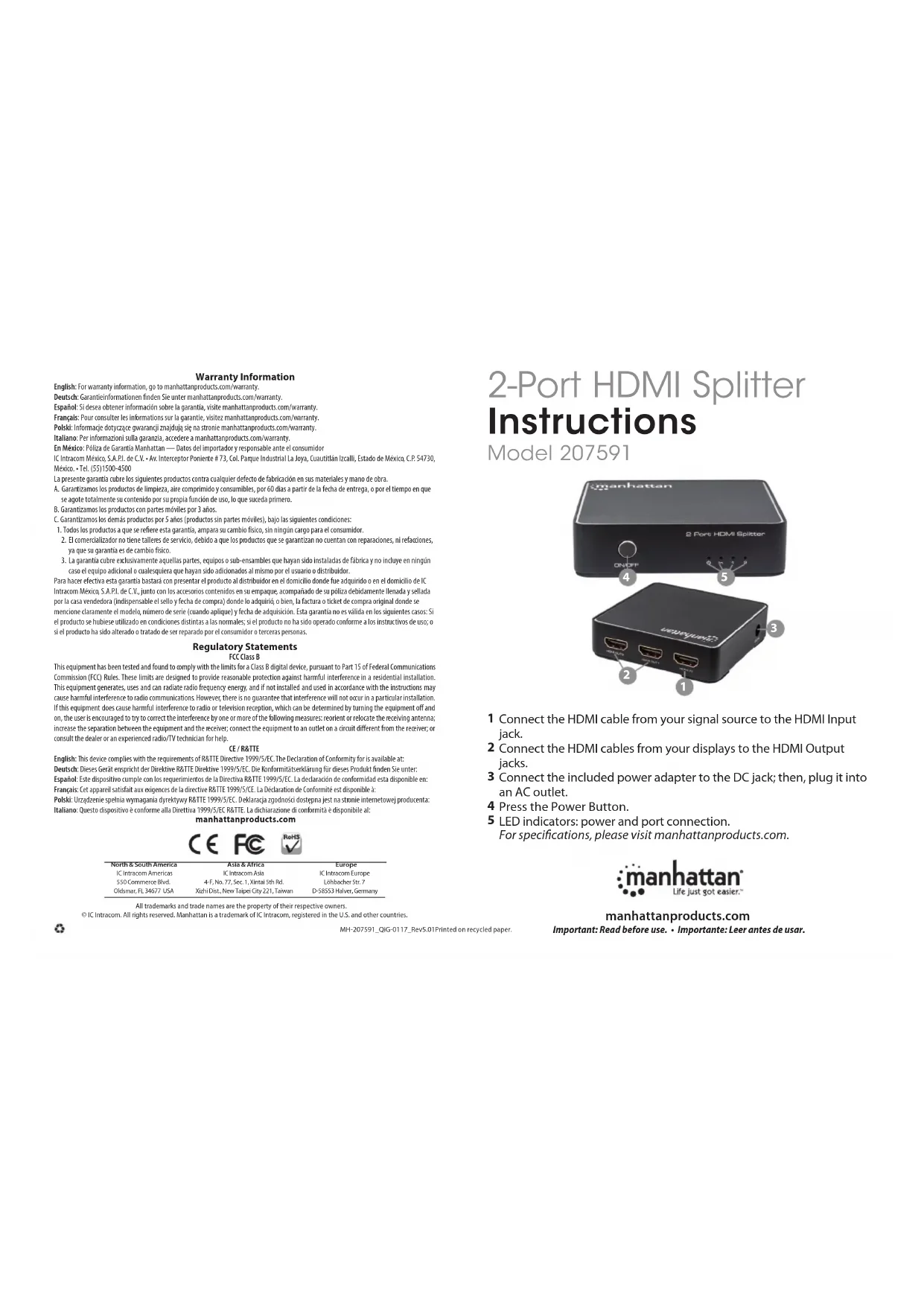 Français: Répartiteur HDMI 2 ports Connectez le câble HDMI de votre source de signal à l’entrée HDMI. Connectez les câbles HDMI de vos écrans aux sorties HDMI. Connectez l’adaptateur secteur inclus au jack d’alimentation, puis branchez-le à une prise de courant. Appuyez sur le bouton marche/arrêt. Voyants DEL : alimentation et connexion du port. Vous trouvez les spécications sur manhattanproducts.com.