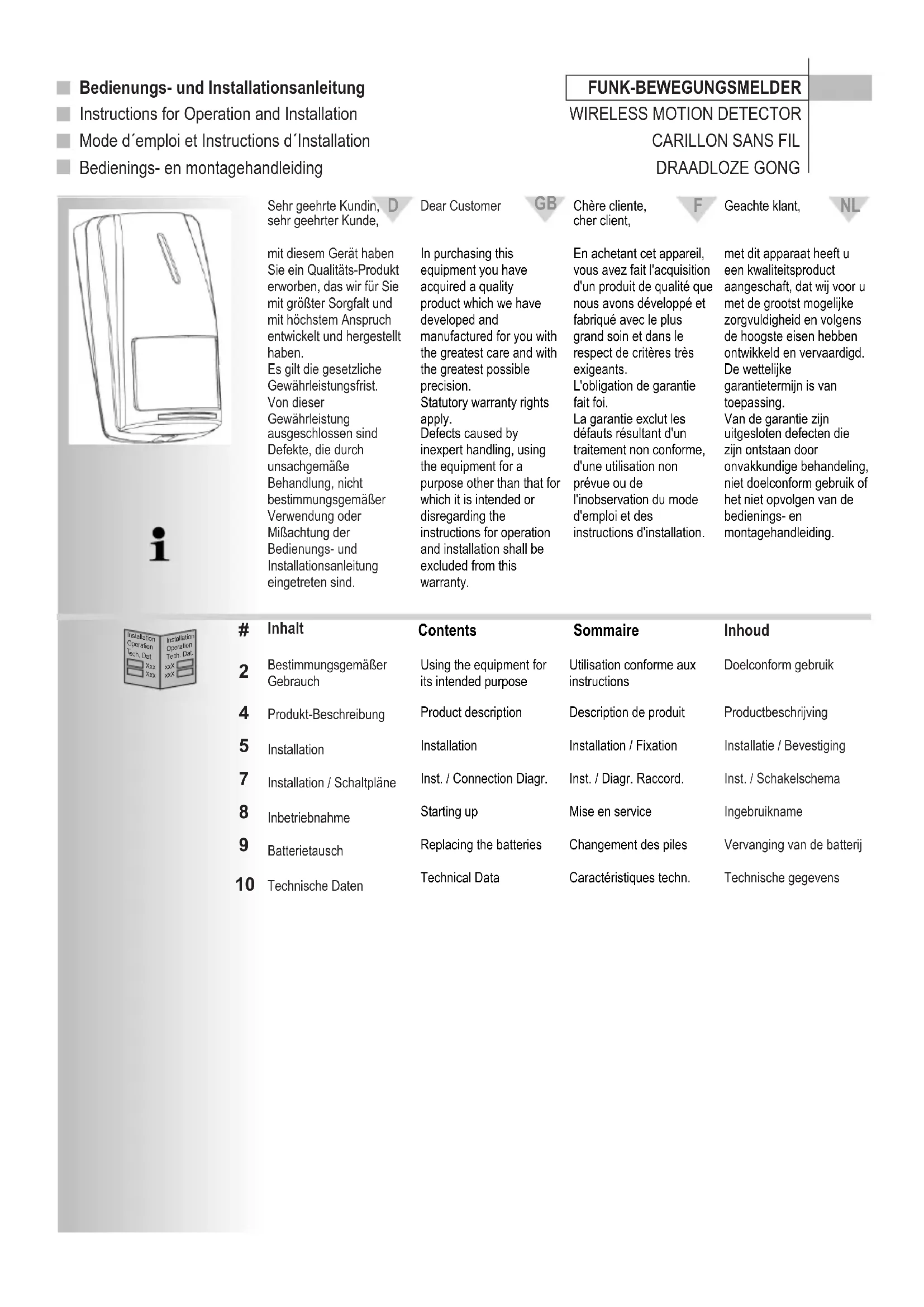 !Pour régler le retardement (minuterie), mettez le potentiomètre à zéro (-) et augmentez le temps progressivement, en tournant dans la direction (+). Retardement ! Le potentiomètre (11) indiqué sur la photo permet de paramétrer un décalage de temps compris entre 3 et 60 secondes environ. Une fois qu'un mouvement est détecté et qu'un processus d'émission est déclenché, une minuterie réglée sur le retardement défini démarre. Les mouvements effectués pendant cette période redémarrent la minuterie. Aucun autre processus d'émission n'est déclenché avant que le décalage ne soit terminé. Tijdsvertraging !Voor het instellen van de vertragingstijd (timer) draait u de potentiometer naar het minimum (-) en verlengt u de tijd gefaseerd door het draaien in de richting (+). !Door middel van de potentiometer (11) op de afbeelding kan een vertraging van tussen ca. 3 en 60 seconden worden ingesteld. Na een geïdentificeerde beweging, die een verzendprocedure activeert, wordt een timer met de ingestelde vertragingstijd gestart. Bewegingen gedurende deze tijd herstarten de timer. Voor afloop van de tijdspanne worden geen verdere verzend- procedures geactiveerd.9 Anlernvorgang an Empfänger ! Durch Betätigung der Taste (10) wird ein Sendevorgang ausgelöst. Dies erfolgt unabhängig von einer erkannten Bewegung oder der Zeiteinstellung. !Verwenden Sie die Taste, um den Sender an einem Funkempfänger anzumelden. Folgen Sie der Anleitung des Funkempfängers, um diesen in den Anlernzustand zu versetzen. !Pressing the test button (10) will initiate a transmission procedure. This will happen regardless of any movement recognised or time set up. !Use this button to configure the transmitter with the radio receiver. Follow the radio receiver instructions to put it into configuration mode. Receiver configuration !L'activation de la touche (10) déclenche le processus d'émission, et ce indépendamment de la détection d'un mouvement ou du réglage d'un retardement. Procédure d'étalonnage du récepteur !Utilisez la touche pour enregistrer l'émetteur auprès d'un récepteur radio. Pour effectuer l'étalonnage du récepteur radio, suivez les instructions indiquées pour le récepteur radio. ! Door het indrukken van de toets (10) wordt een verzendprocedure geactiveerd. Dit vindt plaats onafhankelijk van een geïdentificeerde beweging of de tijdsinstelling. !Gebruik de toets om de zender aan te melden bij en radio-ontvanger. Volg de handleiding van de radio-ontvanger om deze te verzetten in de aanleerstand. Aanleerprocedure in ontvanger