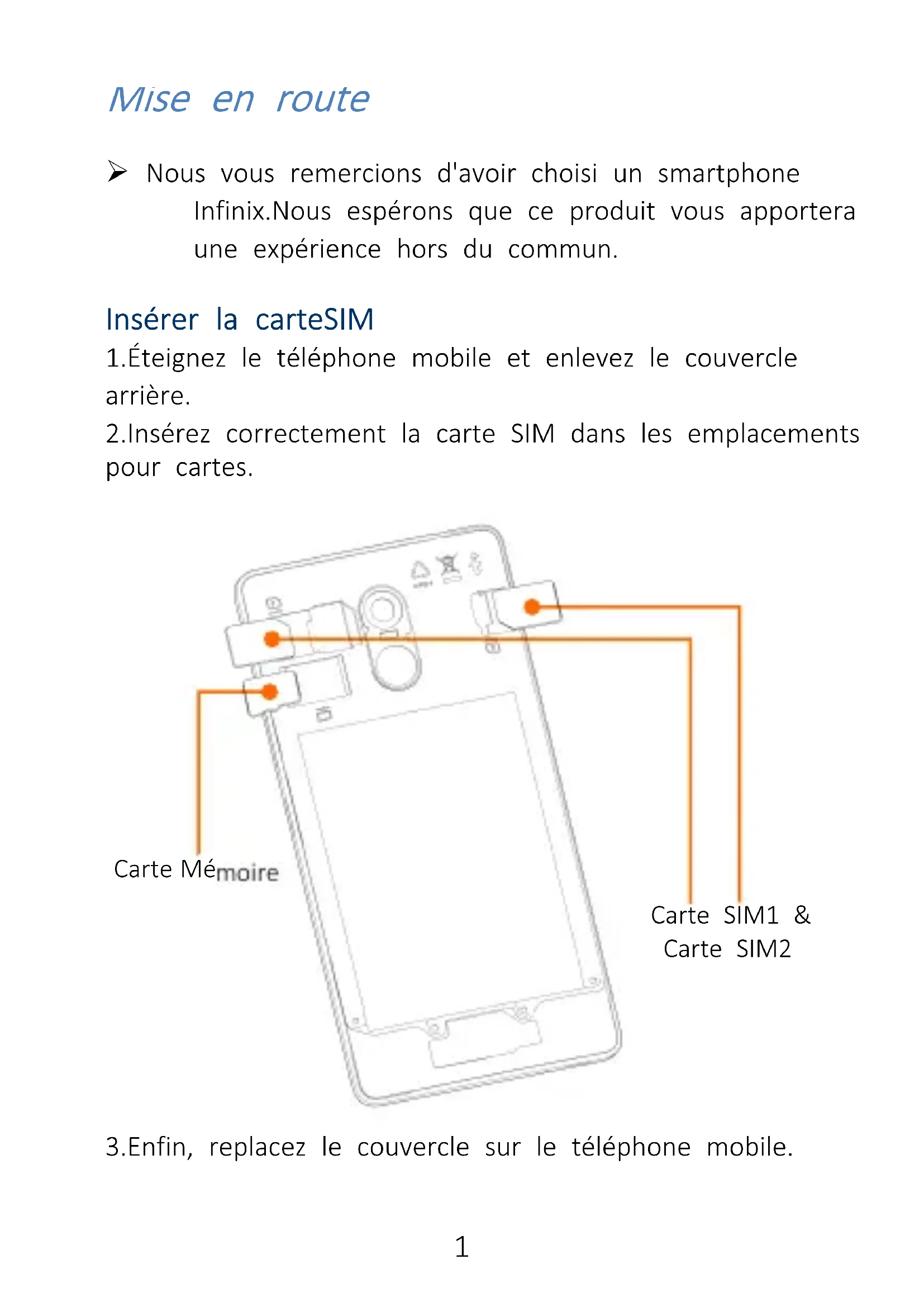Mise en route Nous vous remercions d'avoir choisi un smartphone Infinix.Nous espérons que ce produit vous apportera une expérience hors du commun. Insérer la carteSIM 1.Éteignez le téléphone mobile et enlevez le couvercle arrière. 2.Insérez correctement la carte SIM dans les emplacements pour cartes. 3.Enfin, replacez le couvercle sur le téléphone mobile. Carte Mémoire Carte SIM1 & Carte SIM22 Insérerla carte mémoire