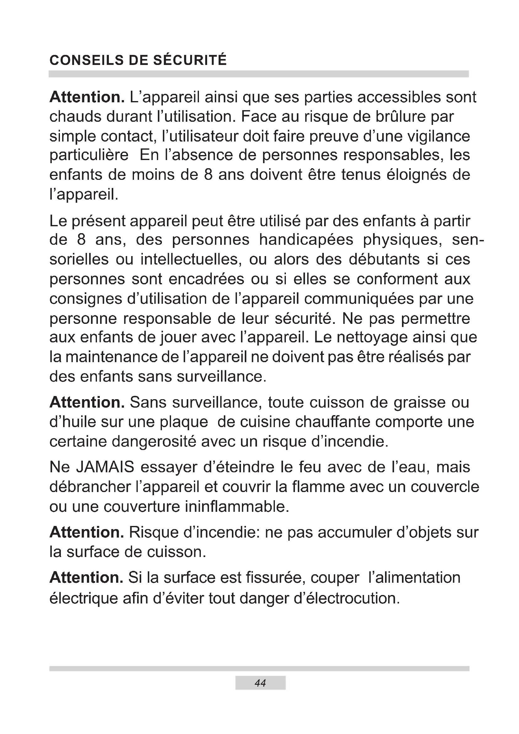 Attention. L’appareil ainsi que ses parties accessibles sont chauds durant l’utilisation. Face au risque de brûlure par simple contact, l’utilisateur doit faire preuve d’une vigilance particulière En l’absence de personnes responsables, les enfants de moins de 8 ans doivent être tenus éloignés de l’appareil. Le présent appareil peut être utilisé par des enfants à partir de 8 ans, des personnes handicapées physiques, sen- sorielles ou intellectuelles, ou alors des débutants si ces personnes sont encadrées ou si elles se conforment aux consignes d’utilisation de l’appareil communiquées par une personne responsable de leur sécurité. Ne pas permettre aux enfants de jouer avec l’appareil. Le nettoyage ainsi que la maintenance de l’appareil ne doivent pas être réalisés par des enfants sans surveillance. Attention. Sans surveillance, toute cuisson de graisse ou d’huile sur une plaque de cuisine chauante comporte une certaine dangerosité avec un risque d’incendie. Ne JAMAIS essayer d’éteindre le feu avec de l’eau, mais débrancher l’appareil et couvrir la amme avec un couvercle ou une couverture ininammable. Attention. Risque d’incendie: ne pas accumuler d’objets sur la surface de cuisson. Attention. Si la surface est ssurée, couper l’alimentation électrique an d’éviter tout danger d’électrocution.45