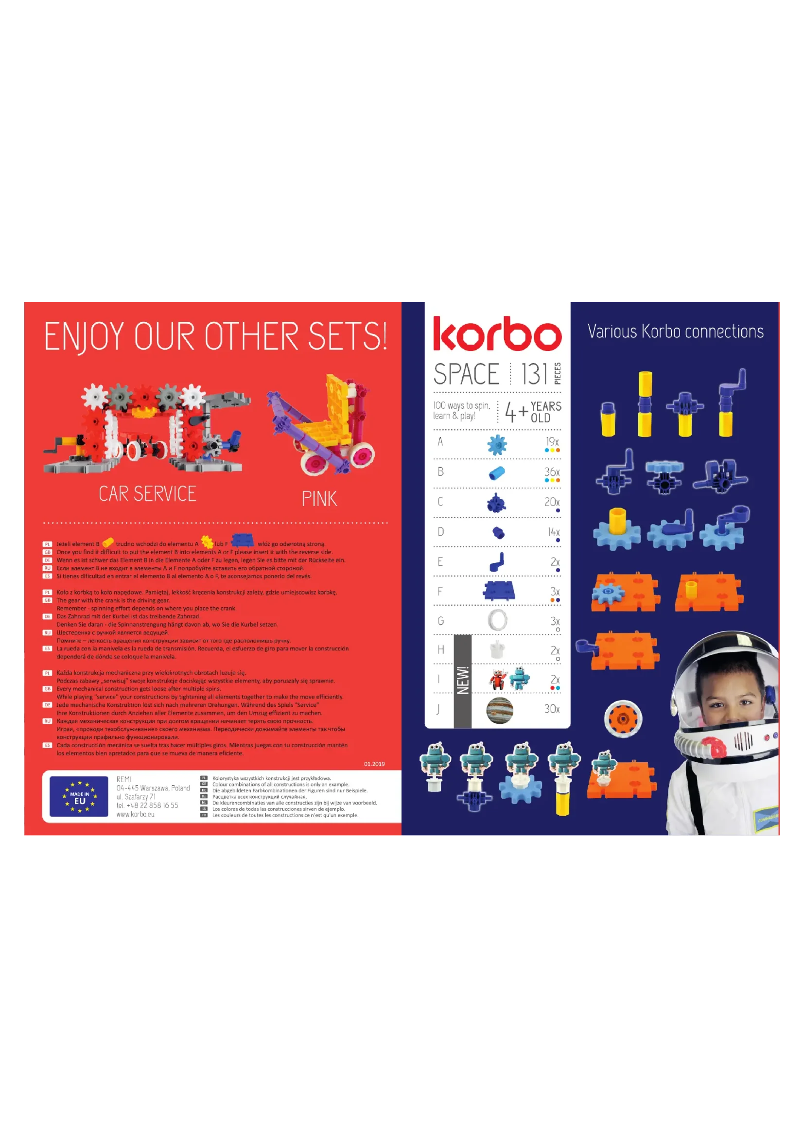 Les pièces du Korbo Space 131 sont conçues spécifiquement pour ce modèle et peuvent ne pas être compatibles avec d'autres kits de maquettisme. Nous recommandons d'utiliser uniquement les pièces fournies.