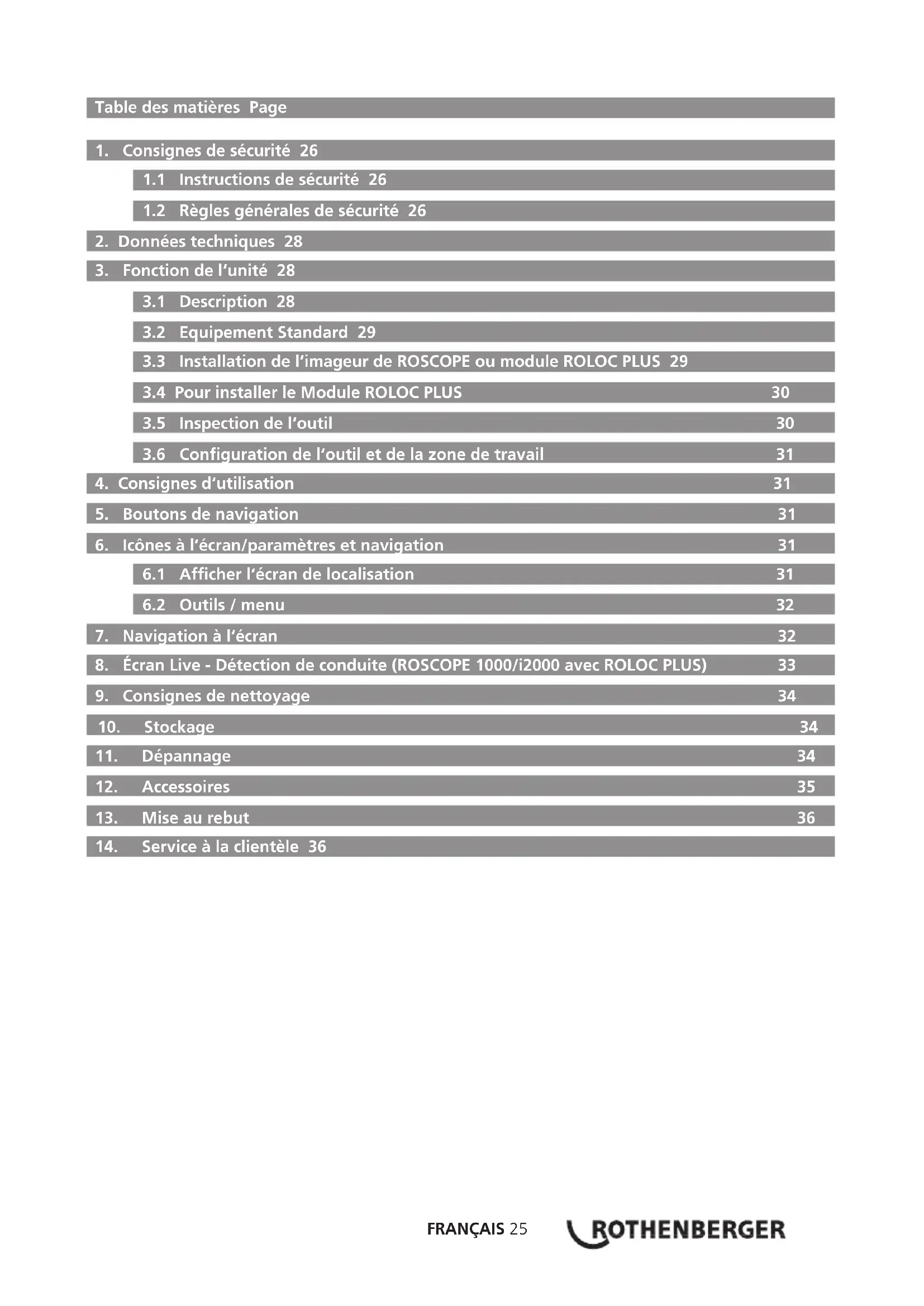 Symptôme Motif possible Solution L'affichage de l'unité ne s'allume pas La batterie est déchargée Rechargez la batterie Vérifiez que la batterie se trouve dans le compartiment de la batterie Placez la batterie dans son compartiment Systèmes électroniques défectueux Contactez le centre de service à la clientèle de ROTHENBERGER L'afficheur s'allume, mais n'affiche pas l'image Desserrez la connexion du câble Vérifiez les connexions des câbles. La tête de la caméra est couverte par des débris Nettoyez la tête de la caméra L'écran affiche une image qui ne répond pas Le processeur d'image a rencontré une erreur Eteignez / allumez l'unité pour réinitialiser le processeur La batterie ne tient pas la charge La batterie pourrait avoir déchargé légèrement pendant le stockage Retirez la batterie lorsque vous stockez Le temps de fonctionnement dépend de l'utilisation du LED Rechargez la batterie le plus souvent en cas d'utilisation prolongée des LED La batterie peut être endommagé Remplacez la batterie Le cycle de vie de la batterie a expiré Remplacez la batterie Aucun signal Mauvaise fréquence Vérifiez la fréquence de votre sonde et adaptez la fréquence du ROLOC à l’aide du menu Mesure de profondeur Indique: ROLOC PLUS hors de portée Vérifiez le signal le plus fort ROSCOPE 1000/i2000 Code d‘erreur 1 « débranché » Erreur présente lorsque l'imageur a été branché et fonctionne, puis a été retiré Contacter le département serviceFRANÇAIS 35 Symptôme Motif possible Solution ROSCOPE 1000/i2000 Code d‘erreur 2 « Numérique/Absence sync vidéo » Indique qu'un imageur numérique a été identifié, mais que la synchronisation vidéo est absente Contacter le département service ROSCOPE 1000/i2000 Code d‘erreur 3 « Analogique/Absence sync vidéo » Indique qu'un imageur analogique a été identifié, mais que la synchronisation vidéo est absente Contacter le département service ROSCOPE 1000/i2000 Code d‘erreur 4 (PPI) « Données vidéo au format incorrect » Indique que les données vidéo ne sont pas au format correct. Contacter le département service ROSCOPE 1000/i2000 Code d‘erreur 5 « Aurore détectée » Il s‘agit d‘une condition dans laquelle le schéma de correction automatique de l‘imageur (imageur numérique uniquement) génère une image avec des artefacts – l‘imageur est alors réinitialisé. Si cette condition persiste après plusieurs tentatives, cette erreur se présente. Contacter le département service ROSCOPE 1000/i2000 Code d‘erreur 6 « Lignes de données liées ou interrompues » Il s'agit d'une erreur de diagnostic automatique lorsque le système se configure pour générer un motif de test ce motif est ensuite validé. Si le motif n'est pas correct, il indique un court-circuit ou un circuit ouvert sur les lignes de données entre les sources vidéo et le processeur principal. Contacter le département service