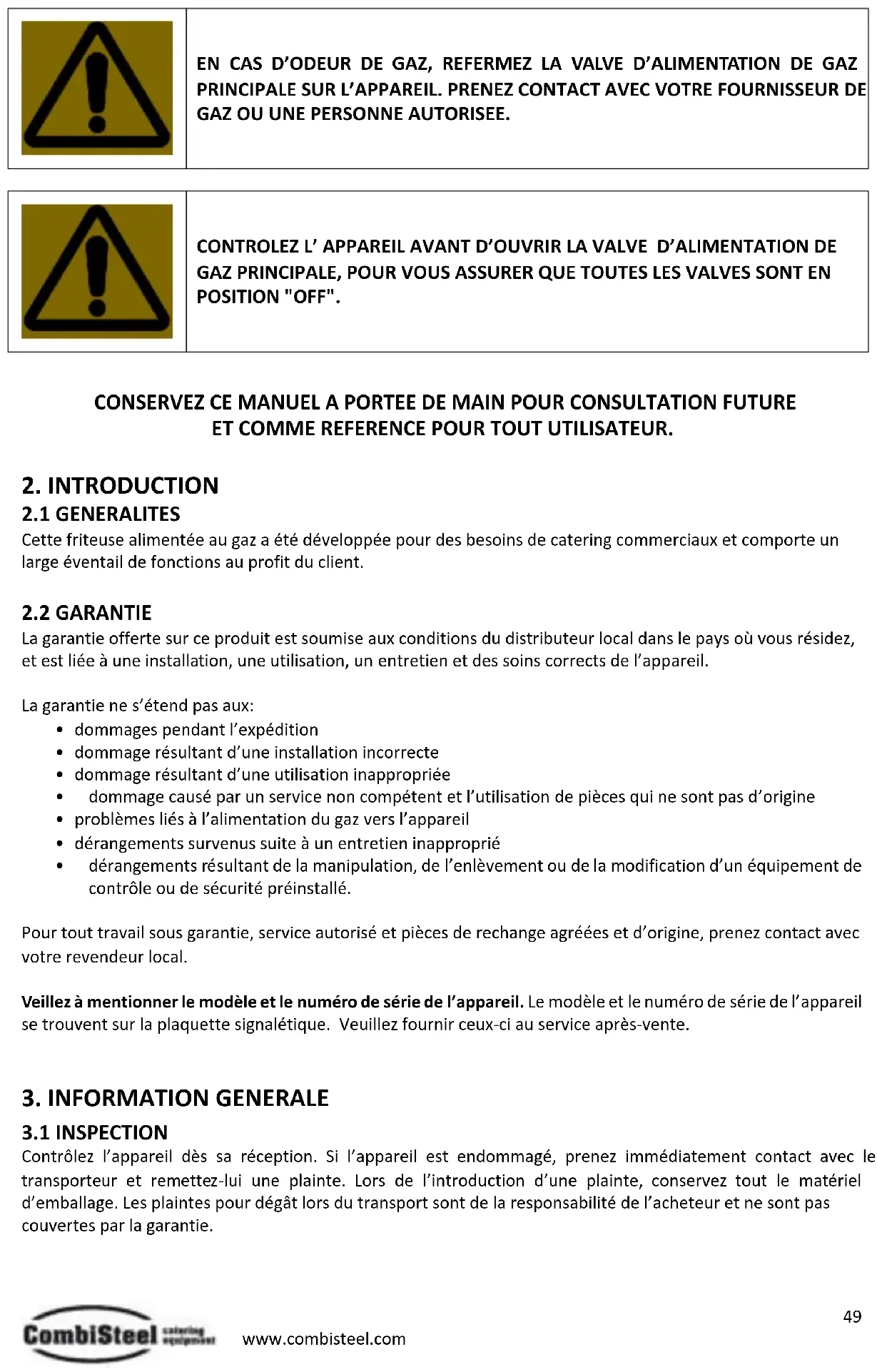 Contrôlez l’appareil dès sa réception. Si l’appareil est endommagé, prenez immédiatement contact avec le transporteur et remettez-lui une plainte. Lors de l’introduction d’une plainte, conservez tout le matériel d’emballage. Les plaintes pour dégât lors du transport sont de la responsabilité de l’acheteur et ne sont pas couvertes par la garantie.50 www.combisteel.com