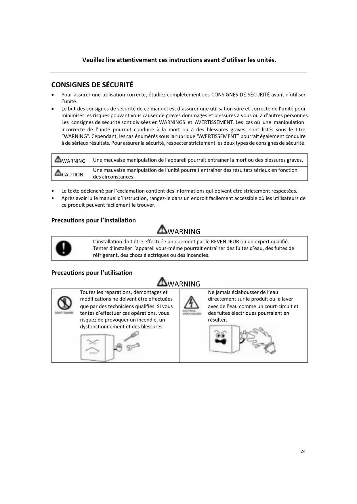 - Après avoir lu le manuel d’instruction, rangez-le dans un endroit facilement accessible où les utilisateurs de ce produit peuvent facilement le trouver. Precautions pour l’installation WARNING