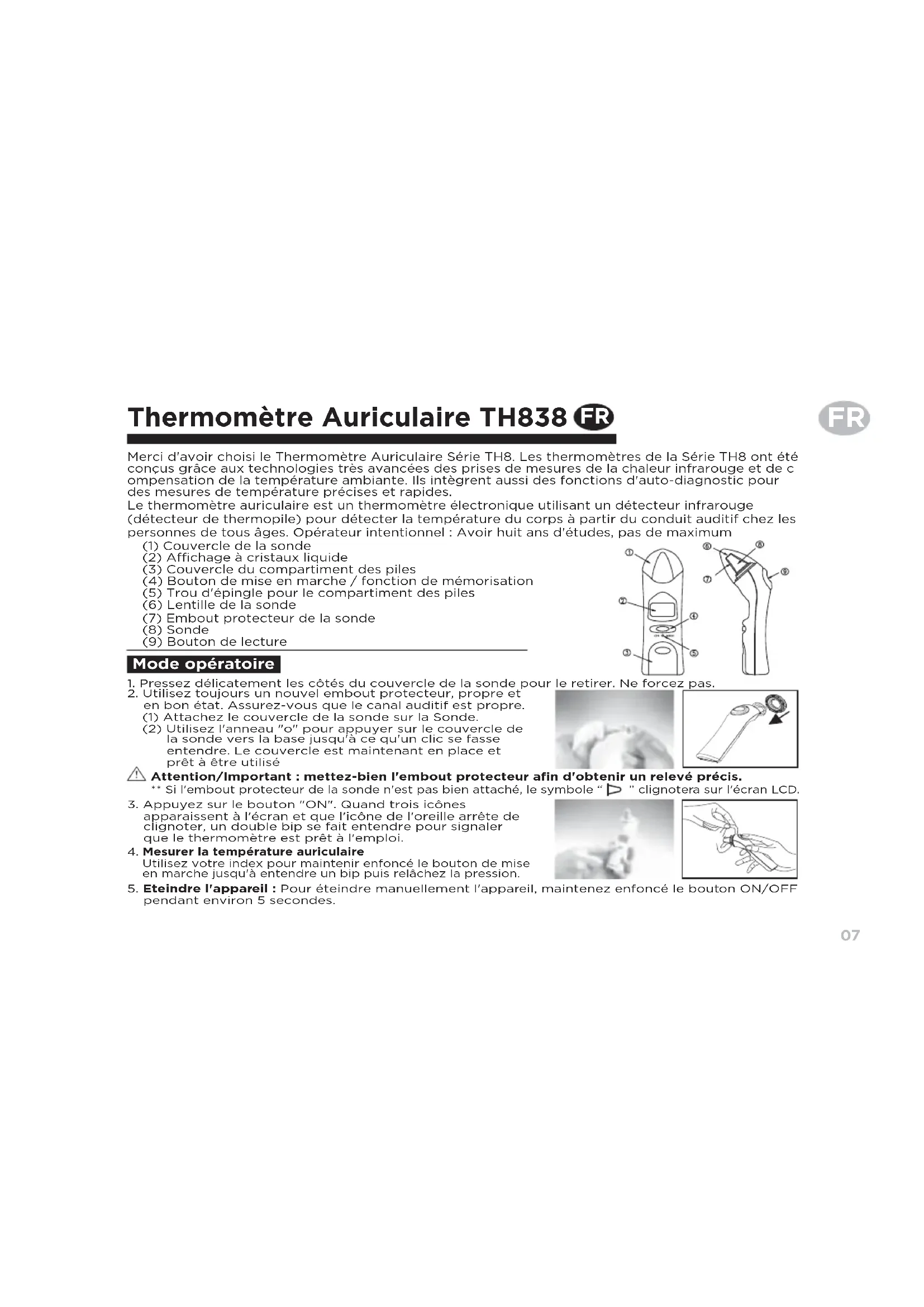 Thermomètre Auriculaire TH838 Merci d'avoir choisi le Thermomètre Auriculaire Série TH8. Les thermomètres de la Série TH8 ont été conçus grâce aux technologies très avancées des prises de mesures de la chaleur infrarouge et de compensation de la température ambiante. Ils intègrent aussi des fonctions d'auto-diagnostic pour des mesures de température précises et rapides.Le thermomètre auriculaire est un thermomètre électronique utilisant un détecteur infrarouge (détecteur de thermopile) pour détecter la température du corps à partir du conduit auditif chez les personnes de tous âges. Opérateur intentionnel : Avoir huit ans d'études, pas de maximum(1) Couvercle de la sonde(2) Affichage à cristaux liquide(3) Couvercle du compartiment des piles(4) Bouton de mise en marche / fonction de mémorisation(5) Trou d'épingle pour le compartiment des piles(6) Lentille de la sonde(7) Embout protecteur de la sonde(8) Sonde(9) Bouton de lecture1. Pressez délicatement les côtés du couvercle de la sonde pour le retirer. Ne forcez pas.2. Utilisez toujours un nouvel embout protecteur, propre et en bon état. Assurez-vous que le canal auditif est propre.(1) Attachez le couvercle de la sonde sur la Sonde.(2) Utilisez l'anneau "o" pour appuyer sur le couvercle de la sonde vers la base jusqu'à ce qu'un clic se fasse entendre. Le couvercle est maintenant en place et prêt à être utiliséAttention/Important : mettez-bien l'embout protecteur afin d'obtenir un relevé précis. ** Si l'embout protecteur de la sonde n'est pas bien attaché, le symbole “ ” clignotera sur l'écran LCD. 3. Appuyez sur le bouton "ON". Quand trois icônes apparaissent à l'écran et que l'icône de l'oreille arrête de clignoter, un double bip se fait entendre pour signaler que le thermomètre est prêt à l'emploi.4. Mesurer la température auriculaire Utilisez votre index pour maintenir enfoncé le bouton de mise en marche jusqu'à entendre un bip puis relâchez la pression.