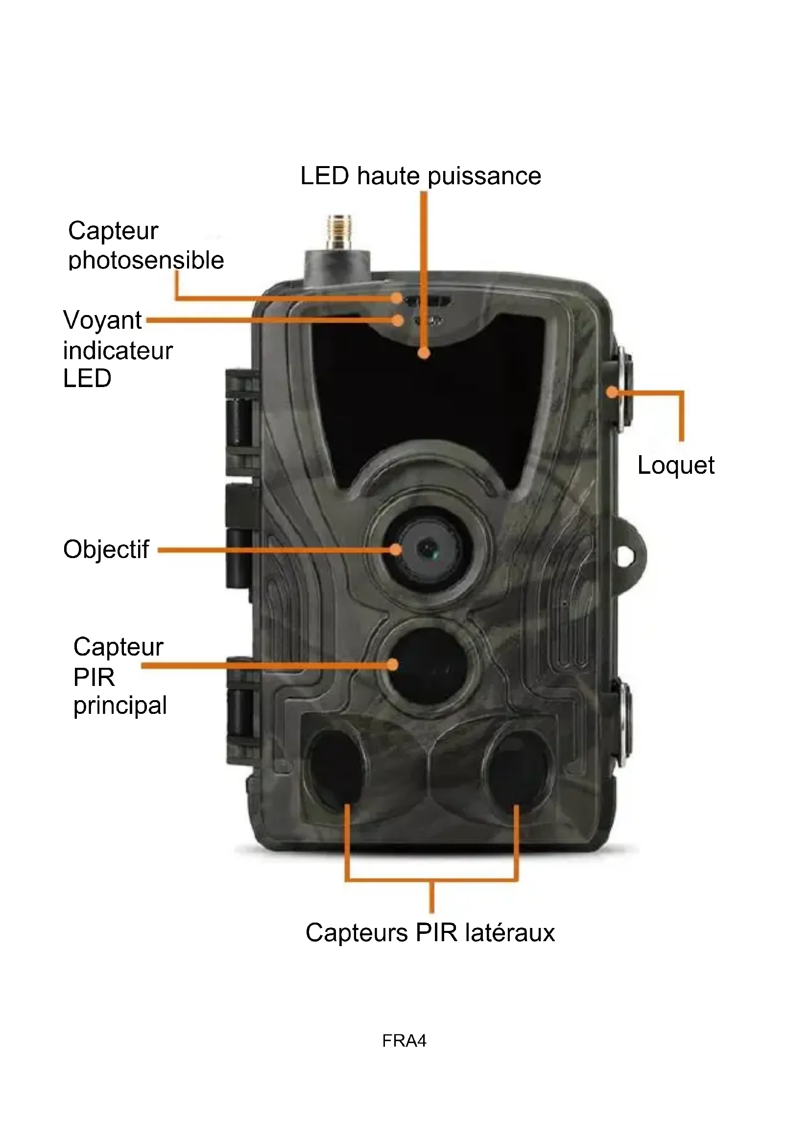 Capteur photosensible Voyant indicateur LED Objectif Capteur PIR principal Capteurs PIR latéraux Loquet LED haute puissanceFRA5