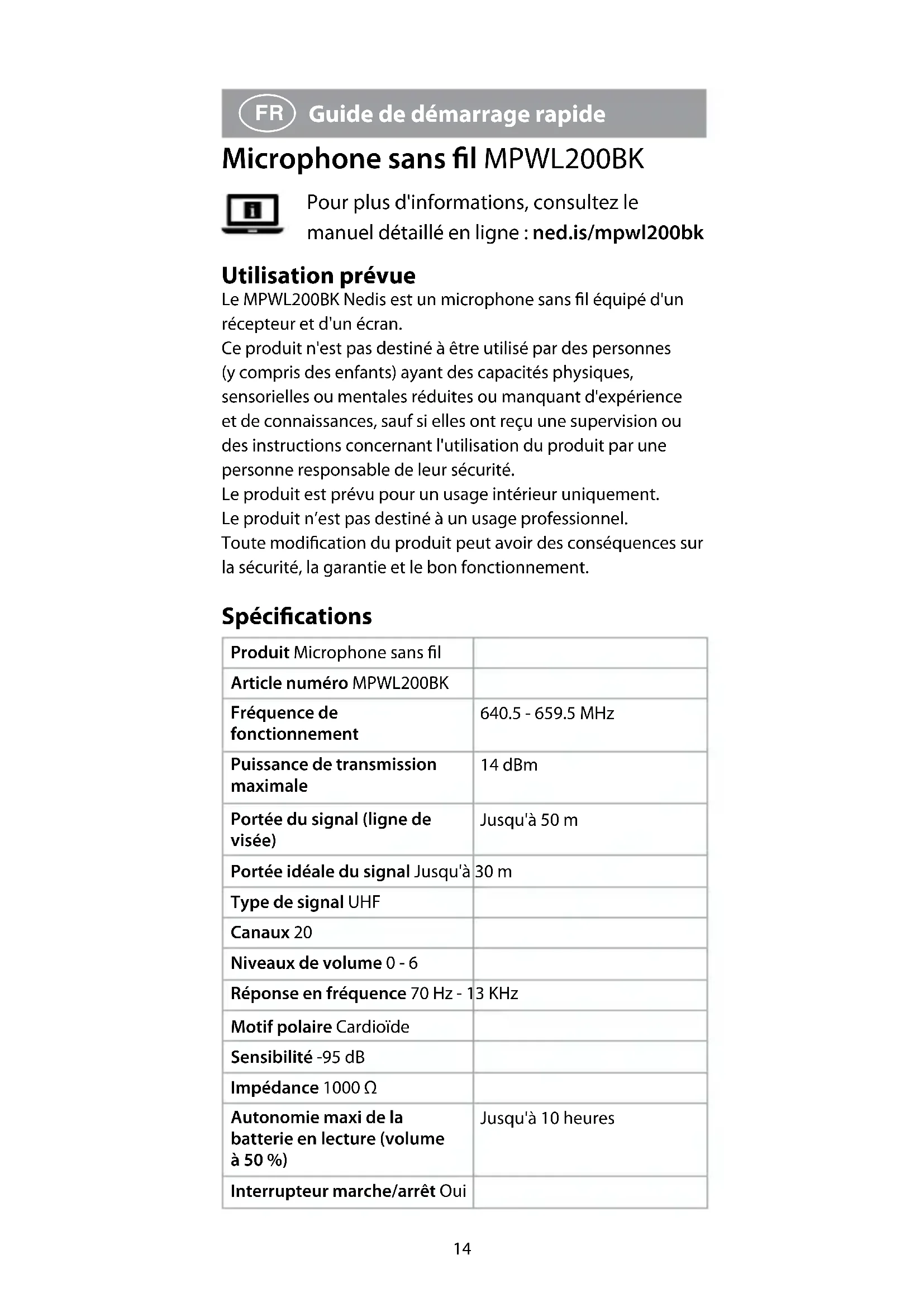 Guide de démarrage rapide Microphone sans l MPWL200BK Pour plus d'informations, consultez le manuel détaillé en ligne : ned.is/mpwl200bk Utilisation prévue Le MPWL200BK Nedis est un microphone sans l équipé d'un récepteur et d'un écran. Ce produit n'est pas destiné à être utilisé par des personnes (y compris des enfants) ayant des capacités physiques, sensorielles ou mentales réduites ou manquant d'expérience et de connaissances, sauf si elles ont reçu une supervision ou des instructions concernant l'utilisation du produit par une personne responsable de leur sécurité. Le produit est prévu pour un usage intérieur uniquement. Le produit n’est pas destiné à un usage professionnel. Toute modication du produit peut avoir des conséquences sur la sécurité, la garantie et le bon fonctionnement. Spécications Produit Microphone sans l Article numéro MPWL200BK Fréquence de fonctionnement