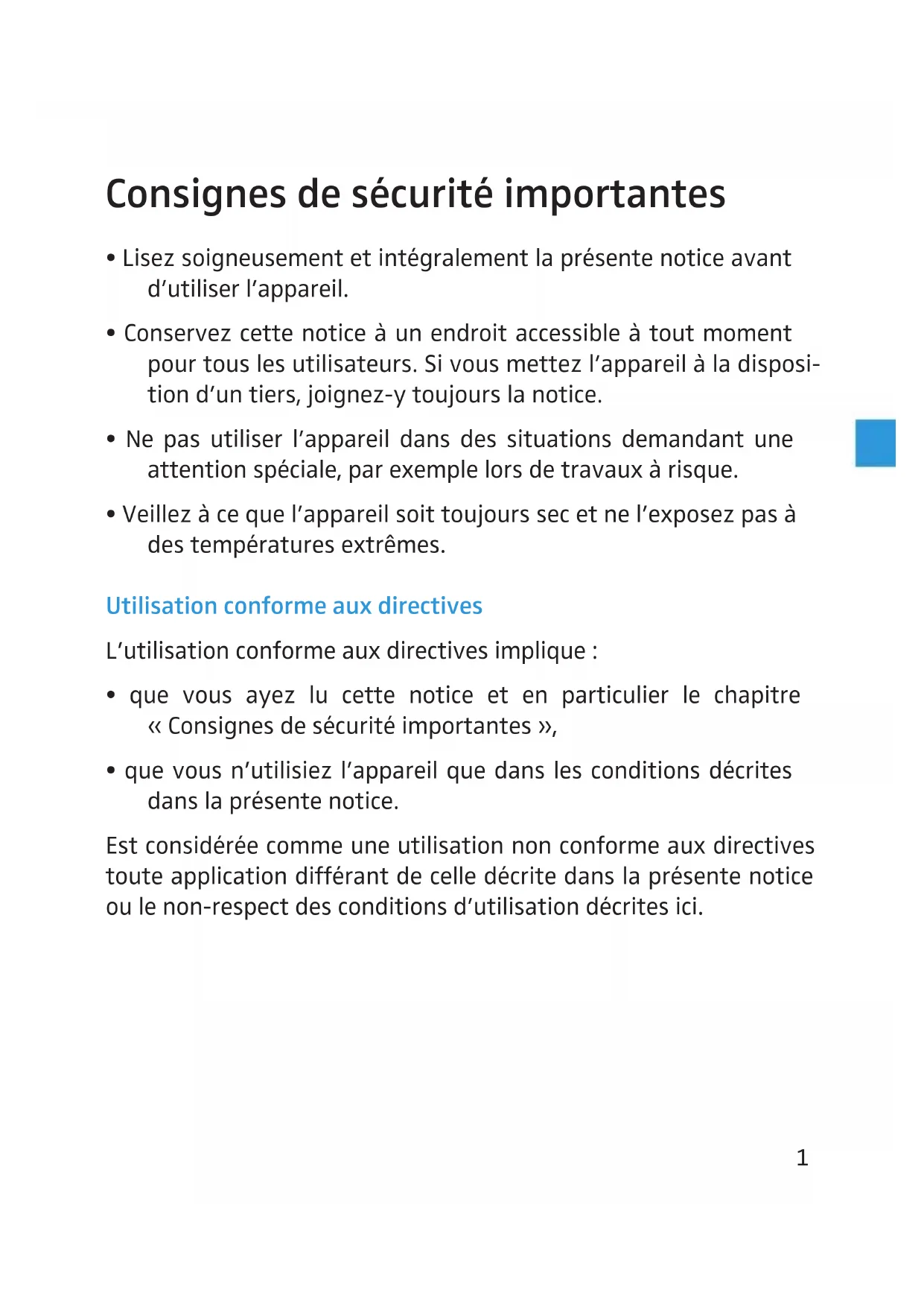 - Veillez à ce que l’appareil soit toujours sec et ne l’exposez pas à des températures extrêmes. Utilisation conforme aux directives L’utilisation conforme aux directives implique :