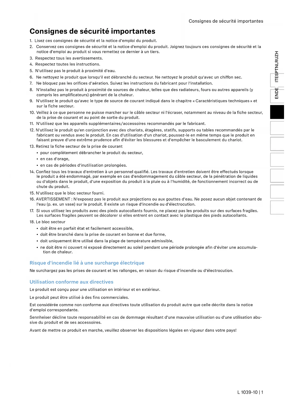 - ne doit être ni couvert ni exposé directement au soleil pendant une période prolongée afin d‘éviter une accumula- tion de chaleur. Risque d‘incendie lié à une surcharge électrique Ne surchargez pas les prises de courant et les rallonges, en raison du risque d‘incendie ou d‘électrocution. Utilisation conforme aux directives Le produit est conçu pour une utilisation en intérieur et en extérieur. Le produit peut être utilisé à des fins commerciales. Est considérée comme non conforme aux directives toute utilisation du produit autre que celle décrite dans la notice d‘emploi correspondante. Sennheiser décline toute responsabilité en cas de dommage résultant d‘une mauvaise utilisation ou d‘une utilisation abu- sive du produit et de ses accessoires. Avant de mettre ce produit en marche, veuillez observer les dispositions légales en vigueur dans votre pays!