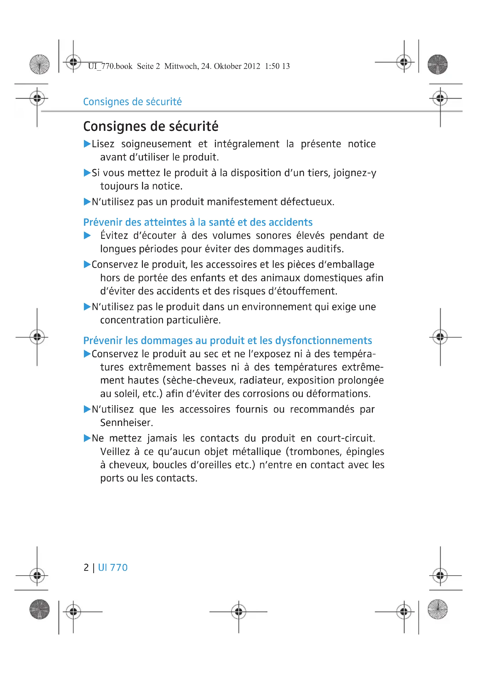 UI_770.book Seite 16 Mittwoch, 24. Oktober 2012 1:50 13FRESNL DE ENIT Déclarations du fabricant UI 770 | 17 Déclaration requise par la FCC et l’Industrie Canada Cet appareil est conforme à la Partie 15 sous-partie b des régle- mentations de la FCC et à la norme NMB-003 d’Industrie Canada. L’utilisation de l’appareil doit respecter les deux conditions sui- vantes : (1) L’appareil ne doit pas produire d’interférences nuisibles, et, (2) il doit accepter toutes interférences reçues, y compris celles qui pourraient avoir des effets non désirés sur son fonctionnement. Cet équipement a été testé et trouvé conforme aux limites définies pour un dispositif numérique de classe B, dans le cadre de la Partie 15 des réglementations de la FCC. Ces limites sont conçues pour offrir une protection raisonnable contre les interférences nocives pour une installation résidentielle. Cet équi- pement produit, utilise et peut émettre une énergie haute fré- quence et, s’il n’est pas installé et utilisé conformément aux instructions, provoquer des interférences gênantes pour les com- munications radio. Des risques d’interférences ne peuvent toute- fois pas être totalement exclus dans certaines installations, même en cas de respect des instructions. Dans le cas d’interférences gênantes pour la réception des émissions de radio ou télédiffusées (il suffit, pour le constater, d’allumer et d’éteindre l’équipement), SENNHEISER Model No: FCC Declaration of Conformity (DoC) We, Sennheiser Electronic Corporation One Enterprise Drive • Old Lyme • CT 06371 • USA Tel: +1 (860) 434 9190, ext. 144 Fax: +1 (860) 434 1759declare the above device comply with the requirements of Federal Communications Commission.This device complies with Part 15 of the FCC rules. Operation is subjected to the following two conditions: 1) This device may not cause harmful interference, and 2) This device must accept any interference received, including interference that may cause undesired operation.Responsible Party: John Falcone UI 770 UI_770.book Seite 17 Mittwoch, 24. Oktober 2012 1:50 13Déclarations du fabricant 18 | UI 770 l’utilisateur est invité à prendre l’une des mesures suivantes pour les éliminer :