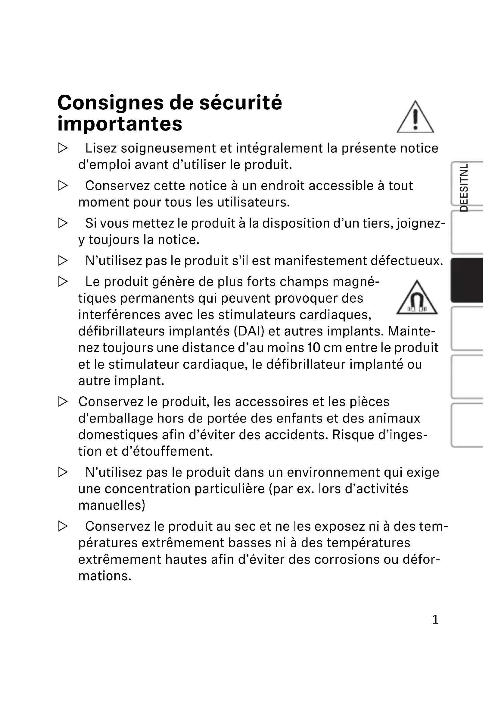 Consignes de sécurité importantes ▷ Lisez soigneusement et intégralement la présente notice d'emploi avant d’utiliser le produit. ▷ Conservez cette notice à un endroit accessible à tout moment pour tous les utilisateurs. ▷ Si vous mettez le produit à la disposition d’un tiers, joignez- y toujours la notice. ▷ N’utilisez pas le produit s'il est manifestement défectueux. ▷ Le produit génère de plus forts champs magné- tiques permanents qui peuvent provoquer des interférences avec les stimulateurs cardiaques, défibrillateurs implantés (DAI) et autres implants. Mainte- nez toujours une distance d’au moins 10 cm entre le produit et le stimulateur cardiaque, le défibrillateur implanté ou autre implant. ▷ Conservez le produit, les accessoires et les pièces d'emballage hors de portée des enfants et des animaux domestiques afin d’éviter des accidents. Risque d’inges- tion et d’étouffement. ▷ N’utilisez pas le produit dans un environnement qui exige une concentration particulière (par ex. lors d’activités manuelles) ▷ Conservez le produit au sec et ne les exposez ni à des tem- pératures extrêmement basses ni à des températures extrêmement hautes afin d’éviter des corrosions ou défor- mations. EZT_3012_532880_0421_SP6.book Seite 1 Mittwoch, 5. Mai 2021 6:46 062 Utilisation conforme aux directives/responsabilité La boucle d’induction EZT 3012 est un accessoire pour les récepteurs infrarouges et haute fréquence Sennheiser ainsi que pour les postes conférence d’un système de conférence. Par une bobine d’induction, l’EZT 3012 transmet à la prothèse auditive le signal sonore fourni. Est considérée comme une utilisation non conforme aux direc- tives toute application différente de celle décrite dans les notices correspondantes. Sennheiser décline toute responsabilité en cas de dommage résultant d'une mauvaise utilisation ou d'une utilisation abu- sive du produit et de ses accessoires. Avant d'utiliser ce produit, veuillez observer les dispositions légales en vigueur dans votre pays. Contenu 1 boucle d’induction EZT 3012 1 notice d’emploi EZT_3012_532880_0421_SP6.book Seite 2 Mittwoch, 5. Mai 2021 6:46 063