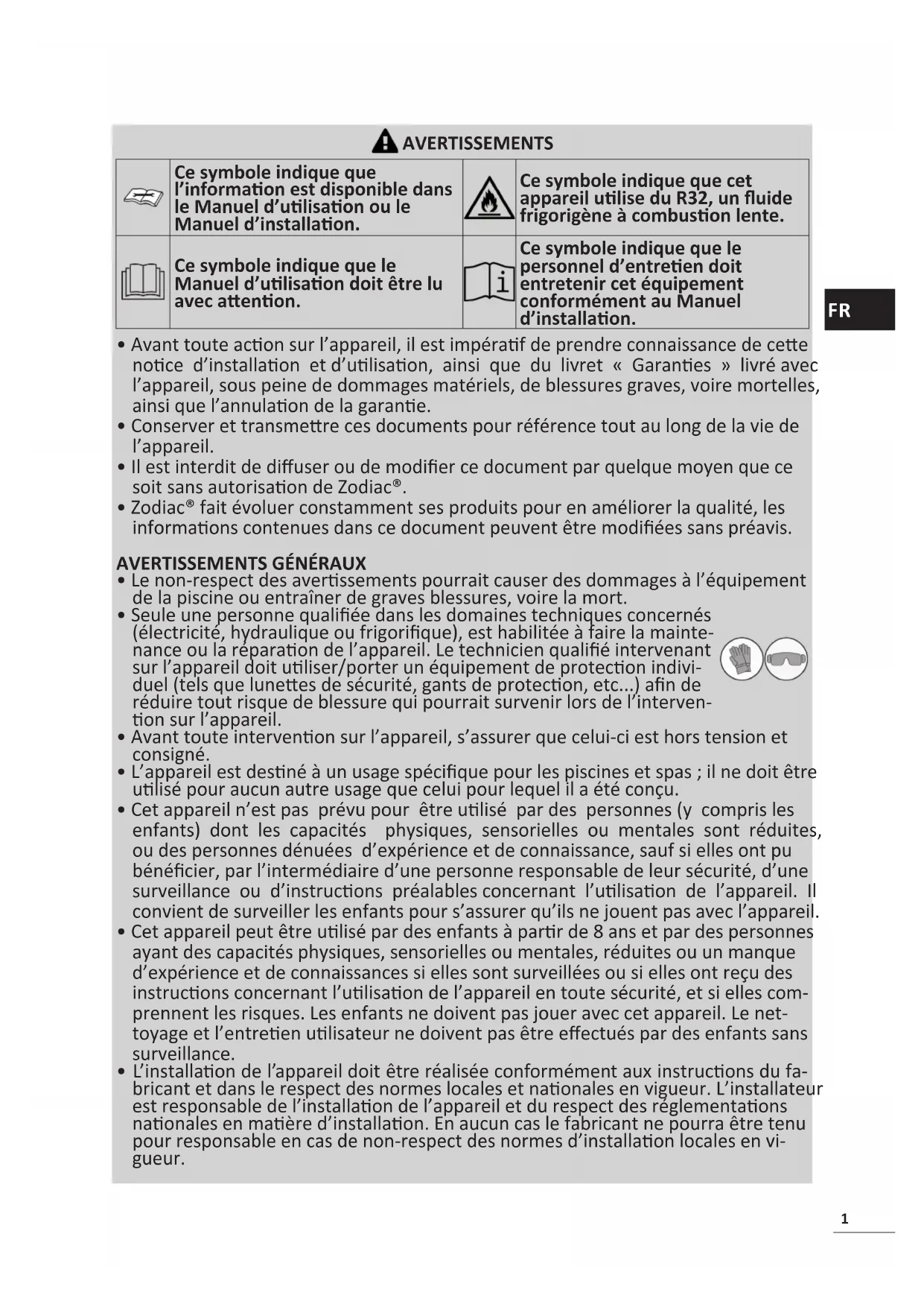 Noce d’installaon et d’ulisaon - Français Pompe à chaleur Instructions originales More documents on: www.zodiac.com1 AVERTISSEMENTS Ce symbole indique que l’informaon est disponible dans le Manuel d’ulisaon ou le Manuel d’installaon. Ce symbole indique que cet appareil ulise du R32, un uide frigorigène à combuson lente. Ce symbole indique que le Manuel d’ulisaon doit être lu avec aenon. Ce symbole indique que le personnel d’entreen doit entretenir cet équipement conformément au Manuel d’installaon.