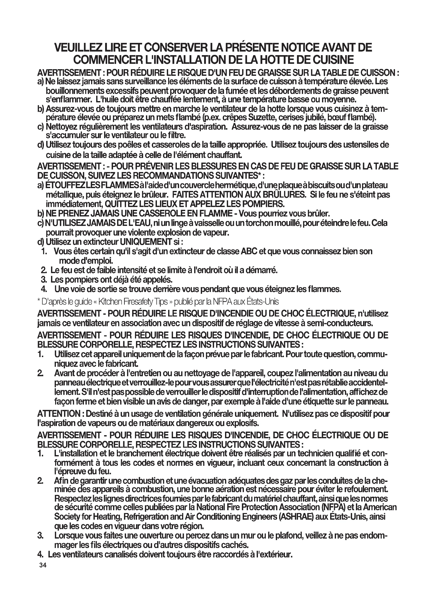- D'après le guide «Kitchen Firesafety Tips» publié par la NFPA aux États-Unis AVERTISSEMENT - POUR RÉDUIRE LE RISQUE D'INCENDIE OU DE CHOC ÉLECTRIQUE, n'utilisez jamais ce ventilateur en association avec un dispositif de réglage de vitesse à semi-conducteurs. AVERTISSEMENT - POUR RÉDUIRE LES RISQUES D'INCENDIE, DE CHOC ÉLECTRIQUE OU DE BLESSURECORPORELLE,RESPECTEZLESINSTRUCTIONSSUIVANTES: