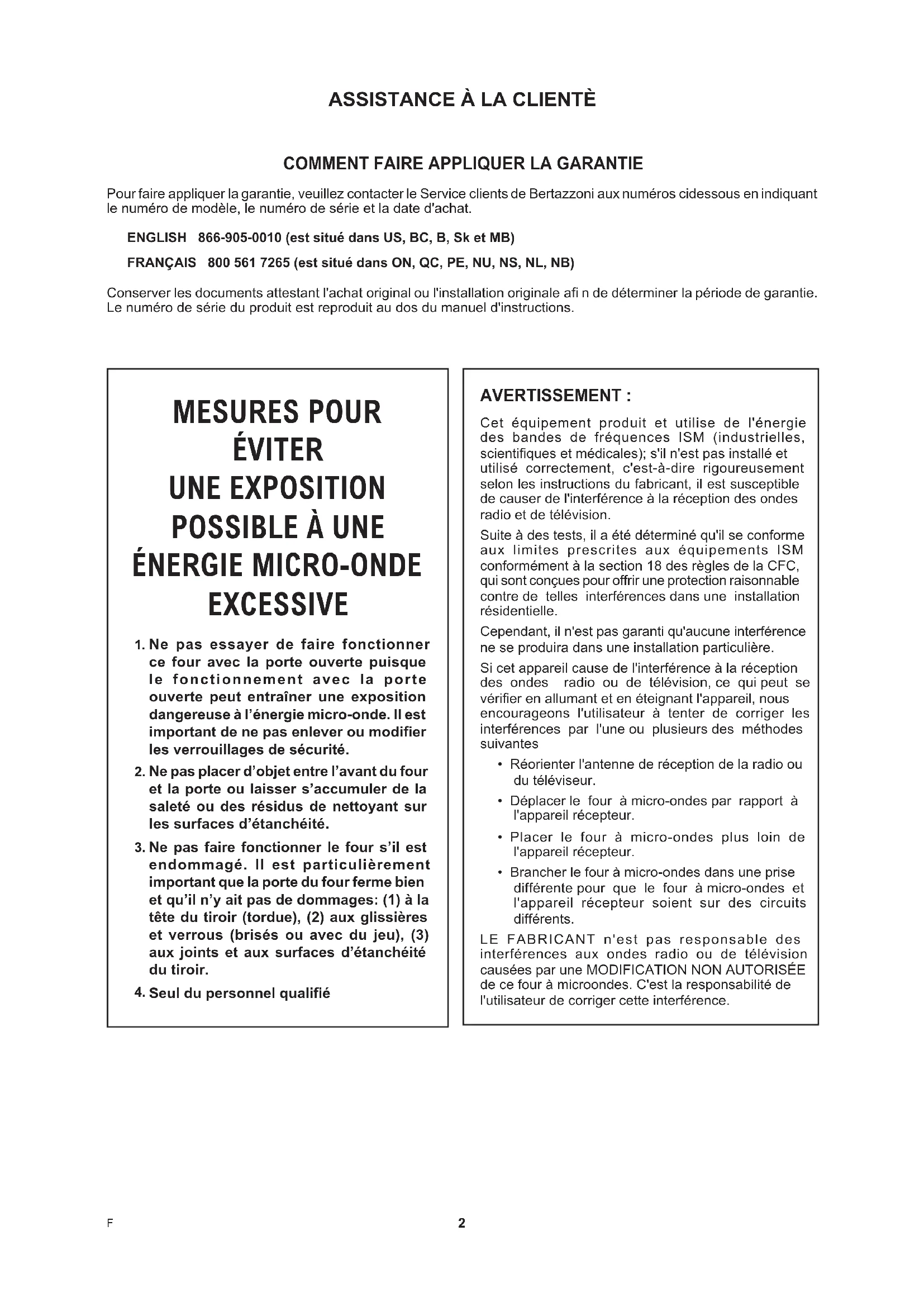 Pour faire appliquer la garantie, veuillez contacter le Service clients de Bertazzoni aux numéros cidessous en indiquant le numéro de modèle, le numéro de série et la date d'achat.ENGLISH 866-905-0010 (est situé dans US, BC, B, Sk et MB)FRANÇAIS 800 561 7265 (est situé dans ON, QC, PE, NU, NS, NL, NB) Conserver les documents attestant l'achat original ou l'installation originale a n de déterminer la période de garantie. Le numéro de série du produit est reproduit au dos du manuel d'instructions.