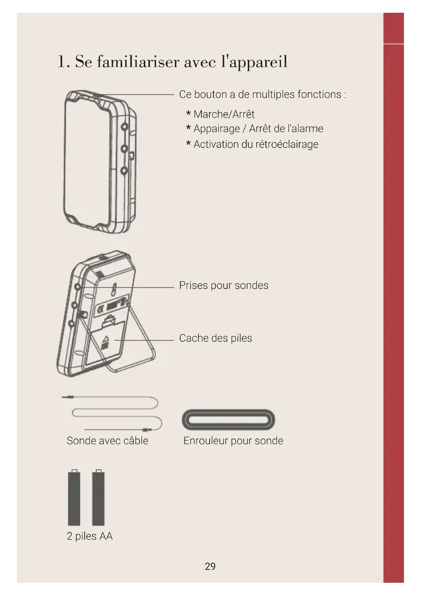 - Activation du rétroéclairage Prises pour sondes Cache des piles Sonde avec câble 2 piles AA Enrouleur pour sonde30 FRSmart BBQ Thermometer / Notice D'utilisation Installer les piles Deux piles de taille AA sont nécessaires pour cet appareil. Veillez à les placer dans le bon sens en suivant les icones sur l'appareil:
