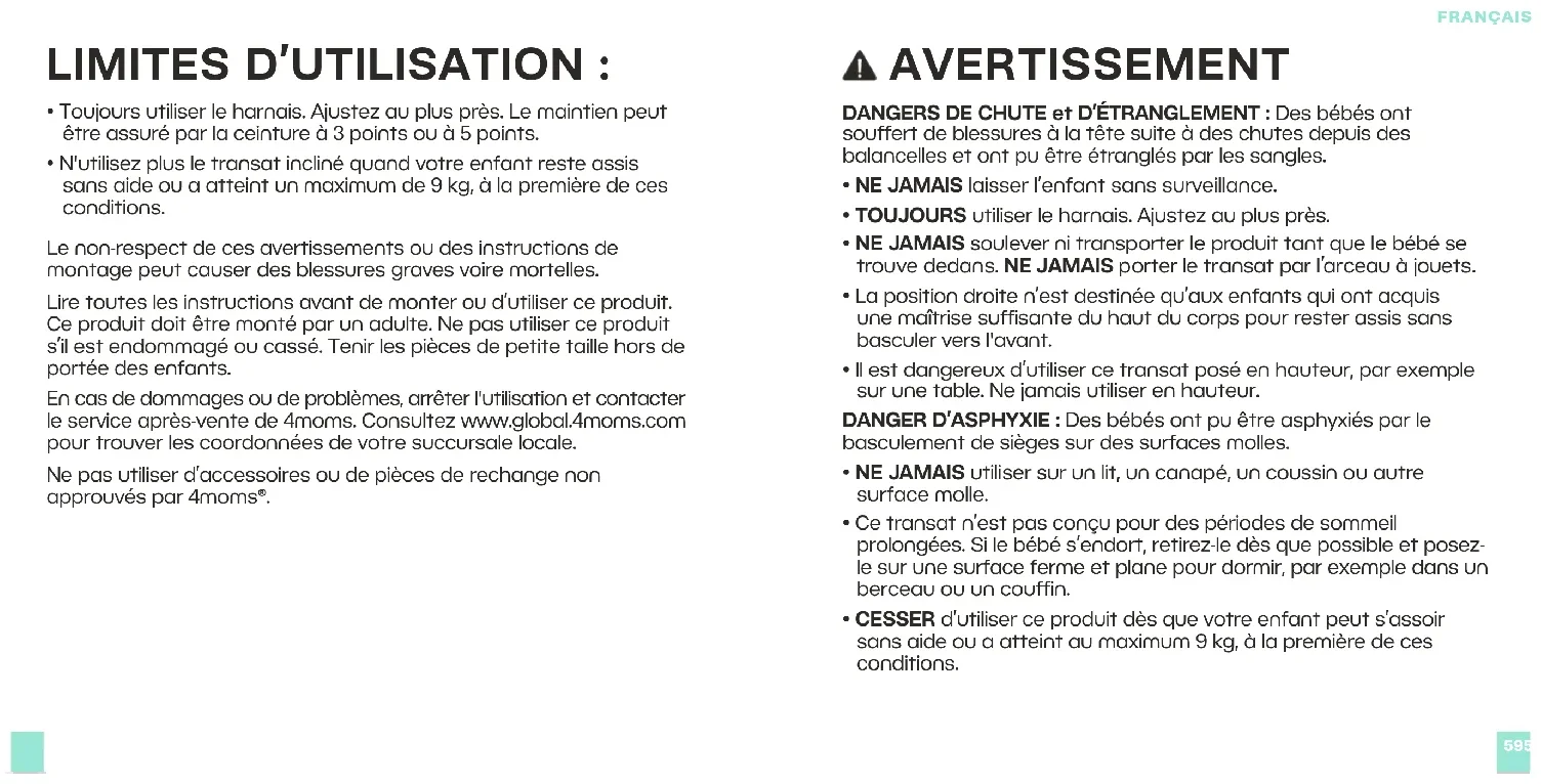 - N'utilisez plus le transat incliné quand votre enfant reste assis sans aide ou a atteint un maximum de 9kg, à la première de ces conditions. Le non-respect de ces avertissements ou des instructions de montage peut causer des blessures graves voire mortelles. Lire toutes les instructions avant de monter ou d’utiliser ce produit. Ce produit doit être monté par un adulte. Ne pas utiliser ce produit s’il est endommagé ou cassé. Tenir les pièces de petite taille hors de portée des enfants. En cas de dommages ou de problèmes, arrêter l'utilisation et contacter le service après-ventede 4moms. Consultez www.global.4moms.com pour trouver les coordonnées de votre succursale locale. Ne pas utiliser d’accessoires ou de pièces de rechange non approuvés par 4moms®. AVERTISSEMENT DANGERS DE CHUTE et D’ÉTRANGLEMENT: Des bébés ont souffert de blessures à la tête suite à des chutes depuis des balancelles et ont pu être étranglés par les sangles.