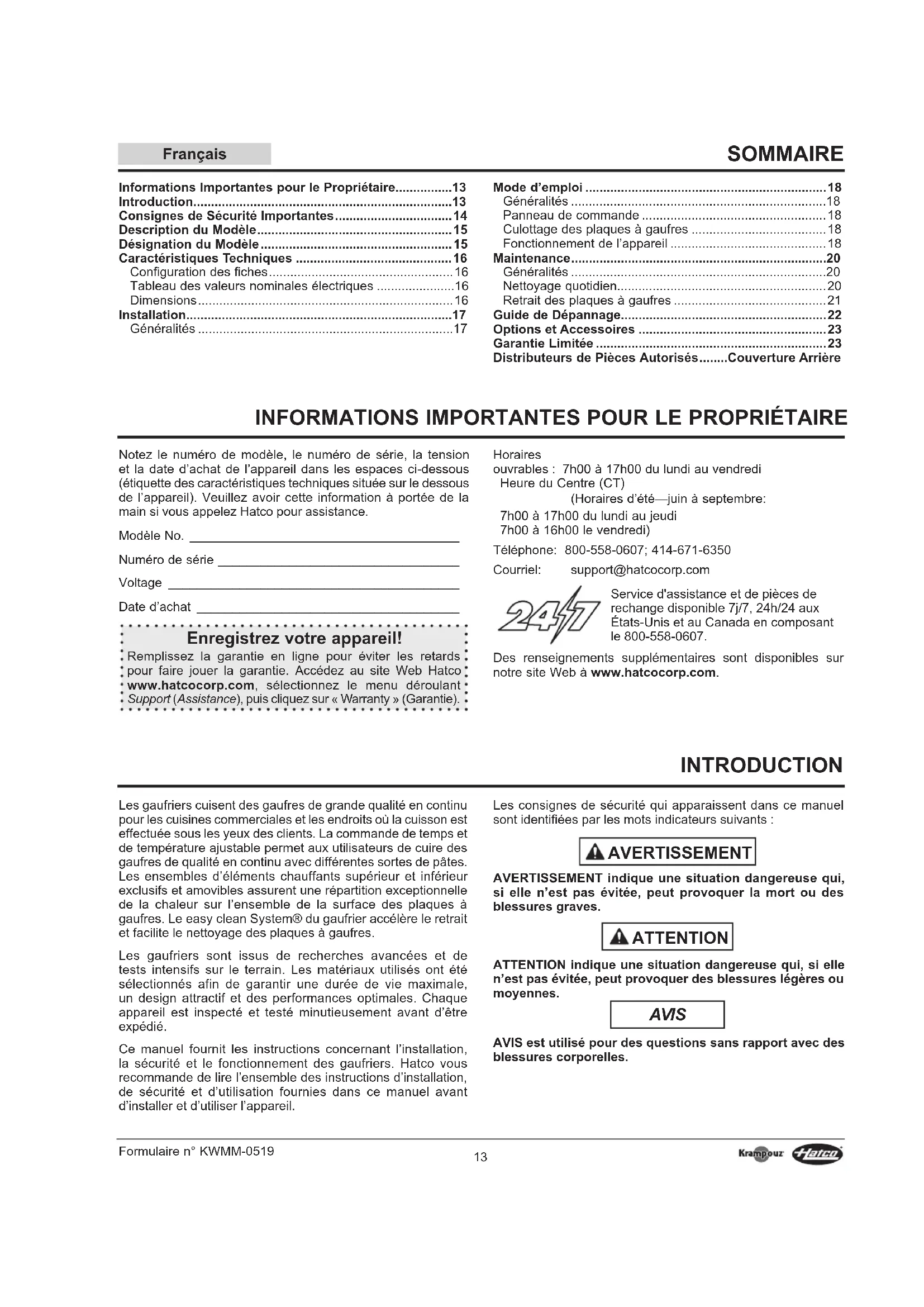 Lisez l’information de securite importante suivante avant d’utiliser cet équipement pour éviter des dommages ou la mort sérieux et pour éviter d’endommager l’équipement ou la propriété. AVERTISSEMENT DANGER DE DÉCHARGE ÉLECTRIQUE : • Brancher l’appareil sur une prise de courant avec terre de tension, de format et de configuration des broches corrects. Si la fiche et la prise ne se correspondent pas, s’adresser à un électricien qualifié pour déterminer et installer une prise de courant de format et de tension corrects. • Mettez hors tension en utilisant l’interrupteur, débranchez le cordon d’alimentation et laissez l’unité refroidir avant d’effectuer tout nettoyage, tout réglage ou tout entretien. • L’appareil n’est pas résistant aux intempéries. Placez l’appareil à l’intérieur, dans une zone dont la température ambiante est de 40°C (104°F) maximum. • NE PAS immerger l’appareil ni le saturer d’eau. L’appareil n’est pas étanche à l’eau. Ne pas le faire fonctionner s’il a été immergé ou saturé d’eau. • Ne pas nettoyer à la vapeur ni utiliser trop d’eau sur l’appareil. • Cet appareil n’est pas étanche aux jets. Ne pas utiliser de jet sous pression pour nettoyer l’appareil. • Ne pas nettoyer l’appareil lorsqu’il est sous tension. • Ne renversez pas de liquides dans l’appareil. • Ne tirez pas l’unité par le cordon d’alimentation. • Ne laissez pas le cordon pendre le long du comptoir. • Interrompez l’utilisation de l’unité si le cordon d’alimentation est effiloché ou usé. • N’essayez jamais de réparer ou de remplacer un cordon d’alimentation. Celui-ci devra être remplacé par Hatco, un agent de service agréé par Hatco ou une personne possédant des qualifications similaires. • Cet appareil doit uniquement être réparé par un personnel qualifié. Toute réparation par un personnel non qualifié peut entraîner une électrocution et des brûlures. • Pour les réparations, utiliser exclusivement des pièces de rechange Hatco d’origine. Utilisez des pièces détachées Hatco authentiques sous peine d’annuler toutes les garanties et d’exposer l’utilisateur à des tensions électriques dangereuses pouvant entraîner une électrocution ou des brûlures. Les pièces de rechange Hatco d’origine sont conçues pour fonctionner sans danger dans les environnements dans lesquels elles sont utilisées. Certaines pièces de rechange génériques ou de second marché ne présentent pas les caractéristiques leur permettant de fonctionner sans danger dans la matériel Hatco.RISQUE D’EXPLOSION : Ne conservez pas ou n’utilisez pas d’essence ou d’autres vapeurs ou liquides inflammables à proximité de ces plaques ou de tout autre appareil.Assurez-vous que tous les opérateurs ont été formés à l’utilisation sûre et correcte de l’appareil.Cet appareil ne doit pas être utilisé par des enfants ou des personnes avec des capacités physiques, sensorielles ou mentales diminuées. Assurez-vous que les enfants sont bien surveillés et tenez-les à l’écart de l’appareil.Ne laissez jamais l’appareil sans surveillance pendant son utilisation. AVERTISSEMENT DANGER D’INCENDIE : • Placezl’appareilàaumoins203mm(8″)desmursetmatières inflammables. Si ces distances de sécurité ne sont pas respectées, une décoloration ou une combustion peut se produire. • N’obstruez pas les ouvertures de ventilation d’air sur le boîtier extérieur de l’appareil. Cela pourrait provoquer une combustion ou une défaillance de l’unité.N’utilisez pas l’appareil pour des fins autres que celles qui ont été prévues.Cet appareil ne contient aucune pièce réparable par l’utilisateur. Si cet appareil doit être réparé, contacter un réparateur Hatco agréé ou le Service après-vente Hatco au 800-558-0607 ou 414-671-6350. ATTENTION DANGER DE BRÛLURE : • Certaines surfaces extérieures de l’appareil deviennent chaudes. Toucher ces zones de l’appareil avec précaution. • N’entrez pas en contact avec les plaques à gaufres pendant le fonctionnement de l’appareil. Les deux plaques sont très chaudes. • Laissez l’appareil refroidir avant d’effectuer tout nettoyage, réglage ou entretien.Placez l’appareil sur un plan de travail dont la hauteur est appropriée, à un emplacement pratique à utiliser. L’emplacement choisi doit être de niveau et solide afin de supporter le poids de l’appareil et de son contenu. AVIS Ne placez pas l’appareil dans une zone soumise à des températures excessives ou exposée à de la graisse provenant de grils, poêles, etc. Des températures excessives et la graisse risquent d’endommager l’appareil.Les dommages à toute partie du comptoir pouvant être causés par la chaleur générée par l’équipement de Hatco ne sont pas couverts par la garantie de Hatco. Contactez le fabricant du comptoir pour plus de renseignements.En ce qui concerne les surfaces en acier, utilisez des chiffons et produits nettoyants non abrasifs uniquement. Les chiffons et nettoyant abrasifs pourraient rayer la finition de l’unité, altérant son apparence et la rendant vulnérable à l’accumulation de saleté.L’utilisation de produits chimiques agressifs tels que l’eau de javel, les produits nettoyants contenant de la javel, ou les produits de nettoyage pour les fours sont proscrits pour nettoyer l’appareil.N’essayez pas de refroidir rapidement les plaques à gaufres chaudes, en les immergeant dans de l’eau par exemple. Cela endommagera les plaques.Cet appareil est réservé à un usage professionnel uniquement — il ne convient PAS à un usage personnel.Nettoyez l’unité quotidiennement pour éviter les dysfonctionnements et assurer un fonctionnement sain.Français Formulaire n° KWMM-0519
