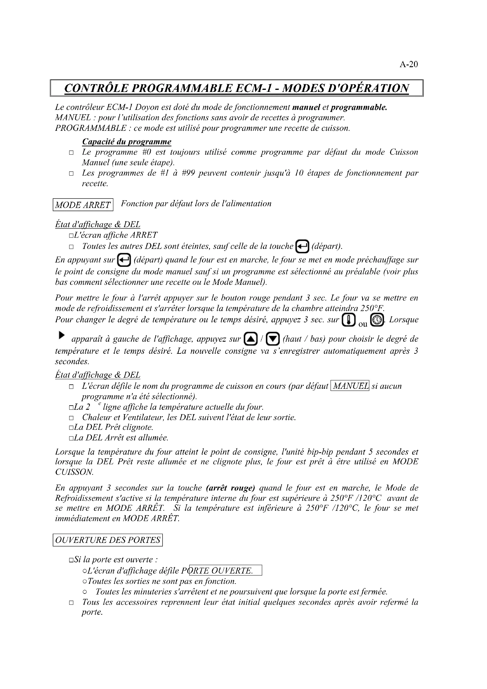 SYSTEM DIAGNOSTICS LANGUAGE DISPLAYA-20 CONTRÔLE PROGRAMMABLE ECM-1 - MODES D'OPÉRATION Le contrôleur ECM-1 Doyon est doté du mode de fonctionnement manuel et programmable. MANUEL : pour l’utilisation des fonctions sans avoir de recettes à programmer. PROGRAMMABLE : ce mode est utilisé pour programmer une recette de cuisson. Capacité du programme □ Le programme #0 est toujours utilisé comme programme par défaut du mode Cuisson Manuel (une seule étape). □ Les programmes de #1 à #99 peuvent contenir jusqu'à 10 étapes de fonctionnement par recette. Fonction par défaut lors de l'alimentation État d'affichage & DEL □ L'écran affiche ARRET □ Toutes les autres DEL sont éteintes, sauf celle de la touche (départ). En appuyant sur (départ) quand le four est en marche, le four se met en mode préchauffage sur le point de consigne du mode manuel sauf si un programme est sélectionné au préalable (voir plus bas comment sélectionner une recette ou le Mode Manuel). Pour mettre le four à l'arrêt appuyer sur le bouton rouge pendant 3 sec. Le four va se mettre en mode de refroidissement et s'arrêter lorsque la température de la chambre atteindra 250°F. Pour changer le degré de température ou le temps désiré, appuyez 3 sec. sur