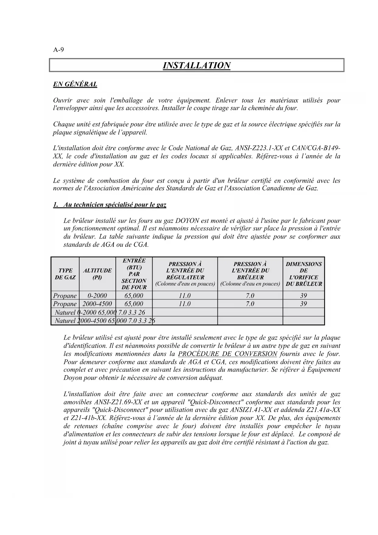 Avant de signer le reçu de livraison, prenez soin de vérifier dès la réception si l'équipement n'est pas endommagé. Si un dommage ou une perte est détecté, écrivez-le clairement sur le reçu de livraison ou votre bon de transport et faites signer le livreur. Si le dommage est remarqué après le départ du transporteur, contactez immédiatement la compagnie de transport afin de leur permettre de constater les dommages causés. Nous ne pouvons assumer la responsabilité pour les dommages ou les pertes qui pourraient survenir pendant le transport.A-3 INSTALLATION WARNINGS The DOYON gas fired ovens are designed to be used with the gas specified on the descriptive nameplate. Refer to National Fuel Gas Code, ANSI-Z223.1 and CAN/CGA.B149. Refer to last edition year for XX. Copies of these are available at: American Gas Association, 1515 Wilson Boulevard, Arlington, Virginia, 22209. Canadian Gas Association, 55 rue Scarsdale, Don Mills, Ontario, Canada, M3B 2R3.