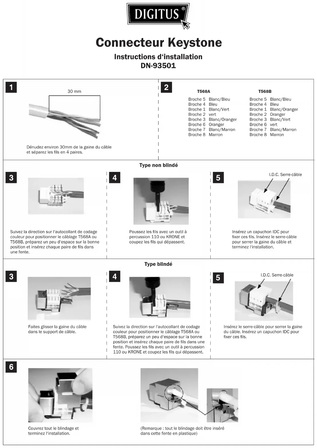 Connecteur Keystone Instructions d‘installation DN-93501 Suivez la direction sur l‘autocollant de codage couleur pour positionner le câblage T568A ou T568B, préparez un peu d‘espace sur la bonne position et insérez chaque paire de ls dans une fente. Poussez les ls avec un outil à percussion 110 ou KRONE et coupez les ls qui dépassent. Type non blindé Type blindé Insérez un capuchon IDC pour xer ces ls. Insérez le serre-câble pour serrer la gaine du câble et terminez l‘installation. 30 mm I.D.C. Serre-câble I.D.C. Serre-câble T568A Broche 5 Blanc/Bleu Broche 4 Bleu Broche 1 Blanc/Vert Broche 2 vert Broche 3 Blanc/Oranger Broche 6 Oranger Broche 7 Blanc/Marron Broche 8 Marron T568B Broche 5 Blanc/Bleu Broche 4 Bleu Broche 1 Blanc/Oranger Broche 2 Oranger Broche 3 Blanc/Vert Broche 6 vert Broche 7 Blanc/Marron Broche 8 Marron Dénudez environ 30mm de la gaine du câble et séparez les ls en 4 paires. Couvrez tout le blindage et terminez l‘installation. (Remarque : tout le blindage doit être inséré dans cette fente en plastique) Faites glisser la gaine du câble dans le support de câble. Suivez la direction sur l‘autocollant de codage couleur pour positionner le câblage T568A ou T568B, préparez un peu d‘espace sur la bonne position et insérez chaque paire de ls dans une fente. Poussez les ls avec un outil à percussion 110 ou KRONE et coupez les ls qui dépassent. Insérez le serre-câble pour serrer la gaine du câble. Insérez un capuchon IDC pour xer ces ls.