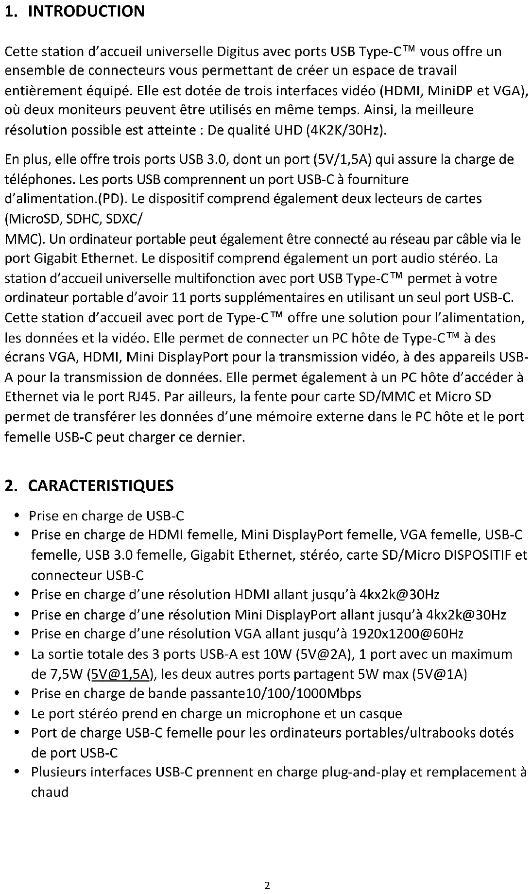 Connecteur entrée/sortie Entrée 1 x USB-C mâle Sortie 1 x HDMI femelle 1 x Mini DP femelle 1 x VGA femelle 1 x USB-C femelle 3 x USB 3.0 femelle 1 x RJ45 1 x Stéréo 1 x Fente pour carte SD 1 x Fente pour carte Micro SD 1 x USB-C femelle pour la Conditions environnementales Température de fonctionnement 0°C - +45°C Humidité de fonctionnement 10% à 90 % HR (sans condensation) Température de stockage -10°C - +70°C Humidité de stockage 10% à 90 % HR (sans condensation) Alimentation électrique Port de charge USB-C 60W (20V/3A) 3 x Port USB-A Sortie totale : 10W (5V@2A) Un port prend en charge 7,5W max. (5V@1,5A) Deux autres ports partagent un maximum de 5W (5V@1A) Accessoires Guide d'utilisation 10 langues5