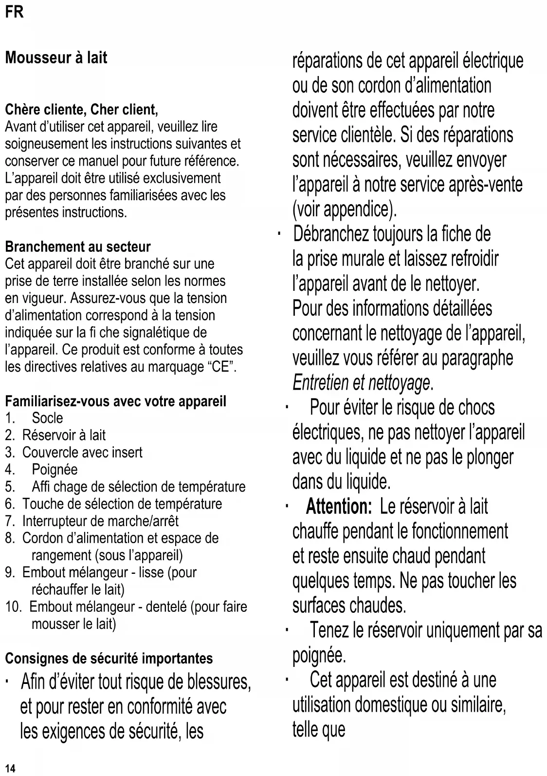 mousser le lait) Consignes de sécurité importantes ∙ Afi n d’éviter tout risque de blessures, et pour rester en conformité avec les exigences de sécurité, les réparations de cet appareil électrique ou de son cordon d’alimentation doivent être effectuées par notre service clientèle. Si des réparations sont nécessaires, veuillez envoyer l’appareil à notre service après-vente (voir appendice). ∙ Débranchez toujours la fi che de la prise murale et laissez refroidir l’appareil avant de le nettoyer. Pour des informations détaillées concernant le nettoyage de l’appareil, veuillez vous référer au paragraphe Entretien et nettoyage. ∙ Pour éviter le risque de chocs électriques, ne pas nettoyer l’appareil avec du liquide et ne pas le plonger dans du liquide. ∙ Attention : Le réservoir à lait chauffe pendant le fonctionnement et reste ensuite chaud pendant quelques temps. Ne pas toucher les surfaces chaudes. ∙ Tenez le réservoir uniquement par sa poignée. ∙ Cet appareil est destiné à une utilisation domestique ou similaire, telle que FR15 - dans les cuisines pour personnel, dans des bureaux et autres locaux commerciaux, - dans des organisations agricoles, - par la clientèle dans les hôtels, motels et hébergements similaires, - et dans des maisons d’hôtes. ∙ Cet appareil peut être utilisé par des enfants (à partir de 8 ans) et par des personnes souffrant de défi ciences physiques, sensorielles ou mentales, ou manquant d’expérience ou de connaissances, s’ils ont été formés à l’utilisation de l’appareil et ont été supervisés, et s’ils en comprennent les dangers et les précautions de sécurité à prendre. ∙ Les enfants ne sont pas autorisés à jouer avec l’appareil. ∙ Les enfants ne doivent pas être autorisés à nettoyer ou entretenir l’appareil à moins d’être supervisés et d’avoir plus de 8 ans. ∙ L’appareil et son cordon d’alimentation doivent être, à tout moment, tenus hors de portée des enfants de moins de 8 ans. ∙ Attention : Tenez les enfants à l’écart des emballages, qui représentent un risque potentiel, par exemple, de suffocation. ∙ Avant toute utilisation, vérifi ez soigneusement que l’appareil, son cordon d’alimentation et ses accessoires ne présentent aucun signe de détérioration qui pourrait avoir un effet néfaste sur la sécurité de fonctionnement de l’appareil. Au cas où l’appareil, par exemple, serait tombé sur une surface dure, ou si une force excessive aurait été employée pour tirer sur le cordon d’alimentation, il ne doit plus être utilisé. ∙ Cet appareil est conçu pour réchauffer et faire mousser le lait uniquement. Ne mettre aucun autre liquide ou aliment solide dans le réservoir. ∙ Ne pas laissez le mousseur à lait sans surveillance lorsqu’il est en marche. ∙ Respectez les niveaux minimum et maximum à l’intérieur du réservoir à chaque utilisation. ∙ L’axe d’entraînement au fond du réservoir (niveau minimum) doit être recouvert par le lait. S’il n’y a pas assez de lait, l’appareil peut surchauffer. ∙ Pour éviter une telle surchauffe, l’appareil s’éteindra alors automatiquement s’il est mis en marche à vide. ∙ Attention : Un remplissage excessif du réservoir peut se révéler dangereux car la mousse de lait risque de déborder le réservoir pendant la préparation. ∙ Attention : Pendant l’utilisation, le couvercle doit être en place. Pour ajouter des ingrédients pendant le fonctionnement, utilisez toujours l’orifi ce de remplissage dans le couvercle. ∙ L’appareil doit être utilisé uniquement avec les accessoires d’origine fournis par le fabricant.16 ∙ L’appareil doit toujours être posé sur une surface solide et stable. ∙ Ne laissez jamais le boîtier ou le cordon d’alimentation entrer en contact avec une fl amme ou une surface chaude telle qu’une plaque chauffante. ∙ Ne laissez pas le cordon d’alimentation pendre librement ; le cordon devra toujours être tenu à l’écart des surfaces brûlantes de l’appareil. ∙ Débranchez toujours la fi che de la prise murale - en cas de fonctionnement défectueux, - après l’emploi, - avant de nettoyer l’appareil. ∙ Ne débranchez pas l’appareil en tirant sur le cordon ; tirez toujours sur la fi che. ∙ Nous déclinons toute responsabilité en cas de dommages éventuels subis par cet appareil, résultant d’une utilisation incorrecte ou du non-respect de ce mode d’emploi. Avant la première utilisation Retirez tous les emballages et assurez-vous que toutes les parties de l’appareil sont présentes. Avant la première utilisation, ou après toute période prolongée de non utilisation, l’appareil doit être soigneusement nettoyé en suivant la méthode décrite au paragraphe Entretien et nettoyage. Opération Nous recommandons l’utilisation de lait écrémé longue durée (1,5% de matières grasses). Pour de meilleurs résultats, le lait doit sortir du réfrigérateur juste avant l’opération. Le dessous du réservoir et la zone de contact à l’intérieur du socle doivent être propres et secs. Choisir l’embout mélangeur ∙ Utilisez l’embout mélangeur lisse pour réchauffer le lait. ∙ Pour faire mousser et réchauffer le lait en même temps, utilisez l’embout mélangeur dentelé. ∙ Pour faire mousser du lait froid, utilisez également l’embout mélangeur dentelé. ∙ Pendant les périodes de non utilisation, rangez soigneusement les embouts mélangeurs à l’arrière du boîtier. Quantités de remplissage ∙ Respectez toujours le repère de remplissage minimum et assurez-vous que le réservoir contient au moins 120 ml de lait. ∙ Pour faire mousser le lait, remplissez le réservoir de 350 ml maximum (repère de remplissage max inférieur