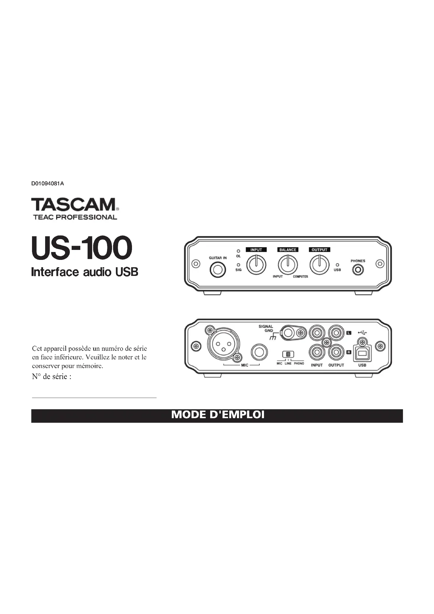 US-100 Interface audio USB D01094081A MODE D'EMPLOI Cet appareil possède un numéro de série en face inférieure. Veuillez le noter et le conserver pour mémoire. N° de série :