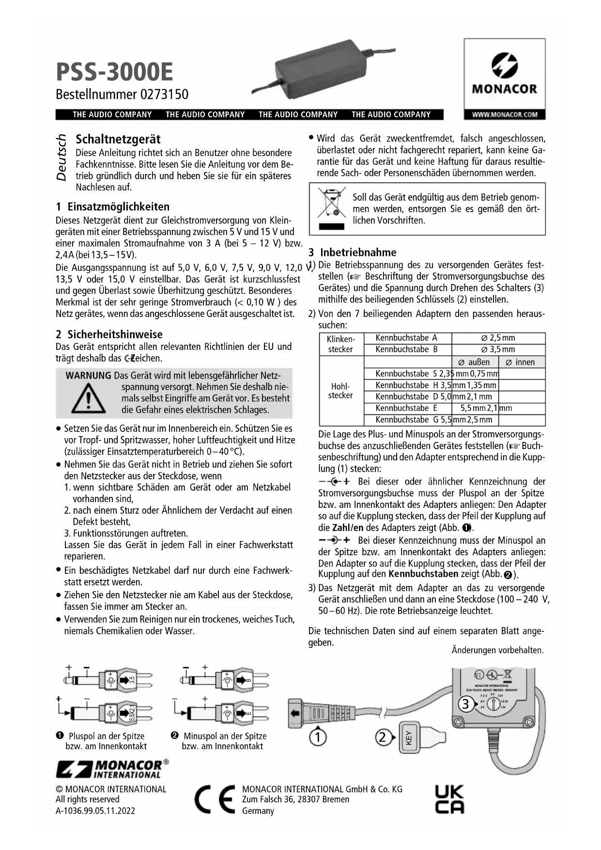 © MONACOR INTERNATIONAL All rights reserved A-1036.99.05.11.2022MONACOR INTERNATIONAL GmbH & Co. KG Zum Falsch 36, 28307 Bremen Germany PSS-3000E Référence numérique 0273150 Alimentation à découpage Cette notice s’adresse aux utilisateurs sans connaissances techniques particulières. Veuillez lire la notice avant le fonctionnement et conservez-la pour pouvoir, si besoin, vous y reporter ultérieurement. 1 Possibilités d’utilisation Cette alimentation permet d’alimenter en courant continu de petits appareils avec une tension d’alimentation entre 5 V et 15 V et une consommation maximale de 3 A (à 5 – 12 V) ou 2,4 A (à 13,5 – 15 V).La tension de sortie est réglable sur 5,0 V, 6,0 V, 7,5 V, 9,0 V, 12,0 V, 13,5 V ou 15,0 V. L’alimentation est protégée contre les courts-circuits, surcharges et surchauffes. Caractéristique par-ticulière : la très faible consommation (< 0,10 W ) de l’alimen-tation lorsque l’appareil relié est éteint. 2 Conseils de sécurité Cet appareil répond à toutes les directives nécessaires de l’Union européenne et porte donc le symbole .AVERTISSEMENT : L’appareil est alimenté par une tension dangereuse. Ne touchez jamais l’inté-rieur de l’appareil car, en cas de mauvaise manipu-lation, vous pouvez subir une décharge électrique. L’appareil n’est conçu que pour une utilisation en intérieur. Protégez-le des éclaboussures, de tout type de projections d’eau, d’une humidité élevée de l’air et de la chaleur (tem-pérature ambiante admissible 0 – 40 °C). Ne faites pas fonctionner l’appareil et débranchez le cordon secteur immédiatement dans les cas suivants :1. l’appareil ou le cordon secteur présente des dommages visibles.2. après une chute ou accident similaire, vous avez un doute sur l’état de l’appareil.3. des dysfonctionnements apparaissent.Dans tous les cas, les dommages doivent être réparés par un technicien spécialisé. Tout cordon secteur endommagé ne doit être remplacé que par un technicien spécialisé. Ne débranchez jamais l’appareil en tirant sur le cordon sec-teur ; retirez toujours le cordon secteur en tirant la fiche. Pour le nettoyage, utilisez un chiffon sec et doux, en aucun cas de produits chimiques ou d’eau. Nous déclinons toute responsabilité en cas de dommages corporels ou matériels résultants si l’appareil est utilisé dans un but autre que celui pour lequel il a été conçu, s’il n’est pas correctement branché, s’il y a surcharge ou s’il n’est pas réparé par une personne habilitée ; en outre, la garantie deviendrait caduque.Lorsque l’appareil est définitivement retiré du service, éliminez-le conformément aux directives locales. 3 Fonctionnement