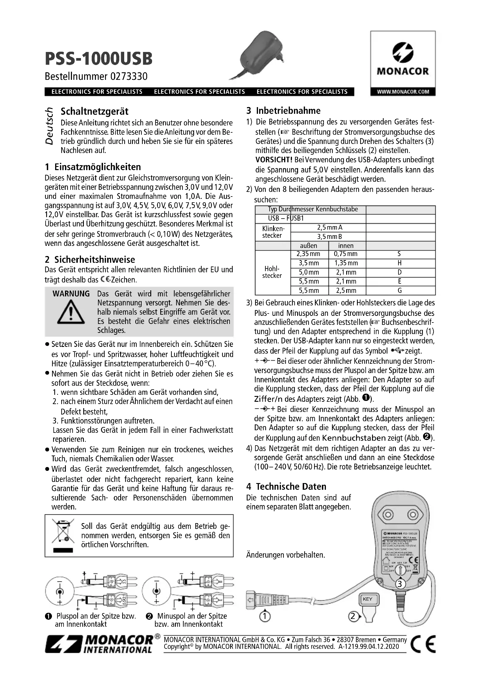 PSS-1000USB Référence numérique 0273330 Alimentation à découpage Cette notice s’adresse aux utilisateurs sans connais- sances techniques particulières. Veuillez lire la notice avant le fonctionnement et conservez-la pour pouvoir, si besoin, vous y reporter ultérieurement. 1 Possibilités d’utilisation Cette alimentation permet d’alimenter en courant continu de petits appareils avec une tension d’alimentation entre 3,0 V et 12,0 V et une consommation maximale de 1,0 A. La tension de sortie est réglable sur 3,0 V, 4,5 V, 5,0 V, 6,0 V, 7,5 V, 9,0 V ou 12,0 V. L’alimentation est protégée contre les courts-circuits, surcharges et surchauffes. Caractéristique particulière : la très faible consommation (< 0,10 W) de l’alimentation lorsque l’appareil relié est éteint. 2 Conseils de sécurité Cet appareil répond à toutes les directives nécessaires de l’Union européenne et porte donc le symbole