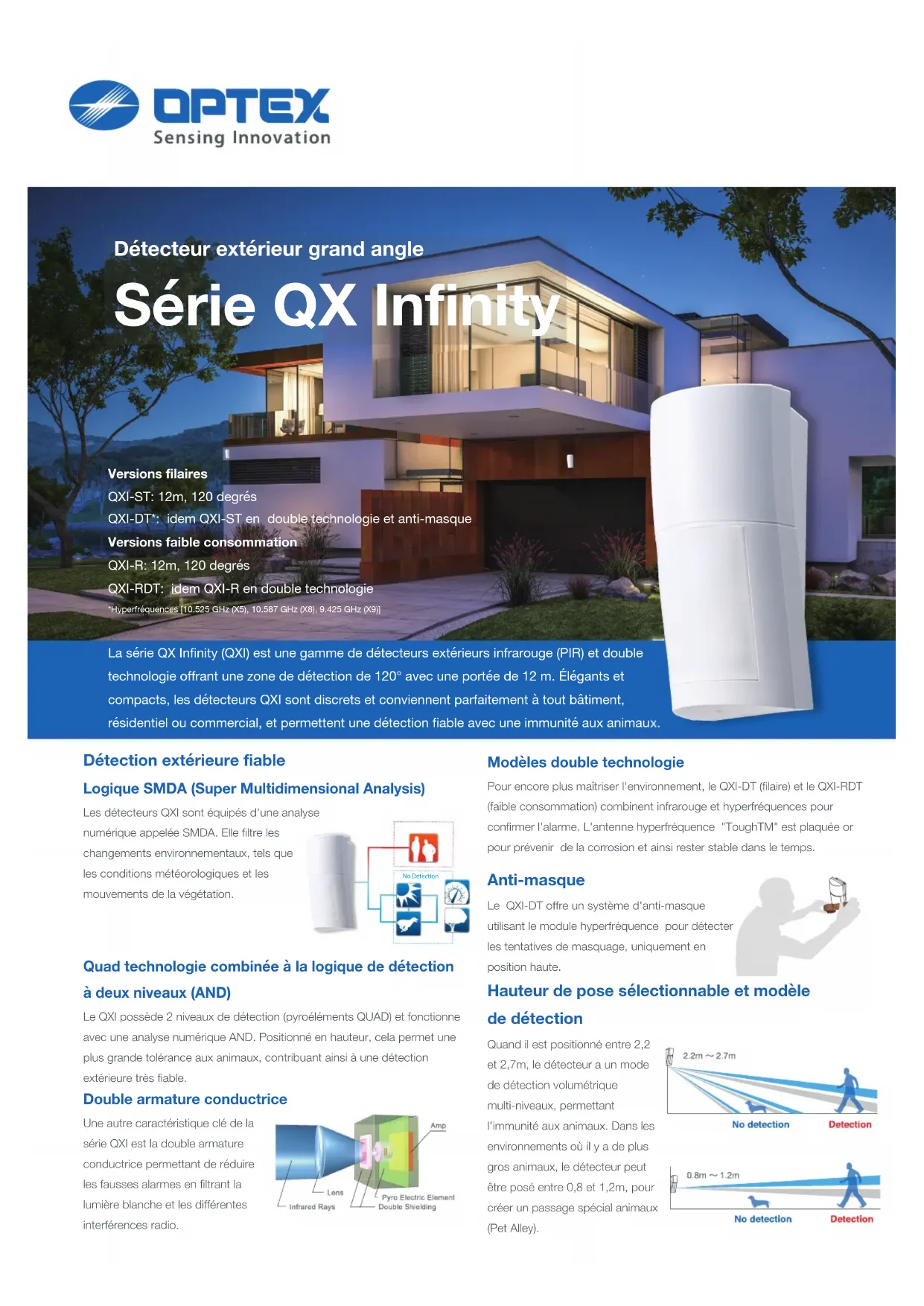 La série QX Infinity (QXI) est une gamme de détecteurs extérieurs infrarouge (PIR) et double technologie offrant une zone de détection de 120° avec une portée de 12 m. Élégants et compacts, les détecteurs QXI sont discrets et conviennent parfaitement à tout bâtiment, résidentiel ou commercial, et permettent une détection fiable avec une immunité aux animaux. Détection extérieure fiable Logique SMDA (Super Multidimensional Analysis) Les détecteurs QXI sont équipés d'une analyse numérique appelée SMDA. Elle filtre les changements environnementaux, tels que les conditions météorologiques et les mouvements de la végétation. Quad technologie combinée à la logique de détection à deux niveaux (AND) Le QXI possède 2 niveaux de détection (pyroéléments QUAD) et fonctionne avec une analyse numérique AND. Positionné en hauteur, cela permet une plus grande tolérance aux animaux, contribuant ainsi à une détection extérieure très fiable. Double armature conductrice Une autre caractéristique clé de la série QXI est la double armature conductrice permettant de réduire les fausses alarmes en filtrant la lumière blanche et les différentes interférences radio.