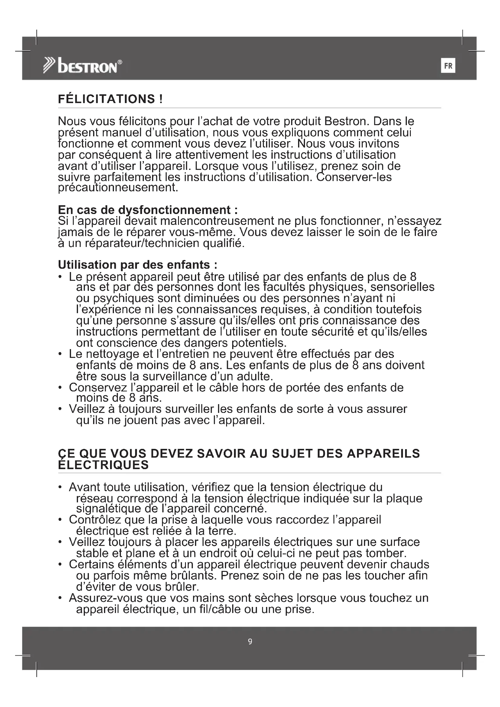 FÉLICITATIONS ! Nous vous félicitons pour l’achat de votre produit Bestron. Dans le présent manuel d’utilisation, nous vous expliquons comment celui fonctionne et comment vous devez l’utiliser. Nous vous invitons par conséquent à lire attentivement les instructions d’utilisation avant d’utiliser l’appareil. Lorsque vous l’utilisez, prenez soin de suivre parfaitement les instructions d’utilisation. Conserver-les précautionneusement. En cas de dysfonctionnement : Si l’appareil devait malencontreusement ne plus fonctionner, n’essayez jamais de le réparer vous-même. Vous devez laisser le soin de le faire à un réparateur/technicien qualifié. Utilisation par des enfants :