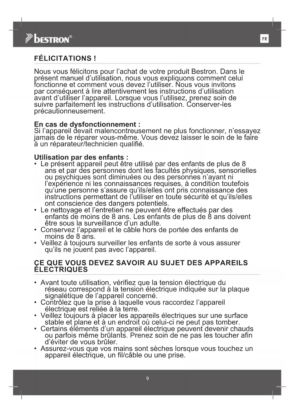 FÉLICITATIONS ! Nous vous félicitons pour l’achat de votre produit Bestron. Dans le présent manuel d’utilisation, nous vous expliquons comment celui fonctionne et comment vous devez l’utiliser. Nous vous invitons par conséquent à lire attentivement les instructions d’utilisation avant d’utiliser l’appareil. Lorsque vous l’utilisez, prenez soin de suivre parfaitement les instructions d’utilisation. Conserver-les précautionneusement. En cas de dysfonctionnement : Si l’appareil devait malencontreusement ne plus fonctionner, n’essayez jamais de le réparer vous-même. Vous devez laisser le soin de le faire àunréparateur/technicienqualifié. Utilisation par des enfants :