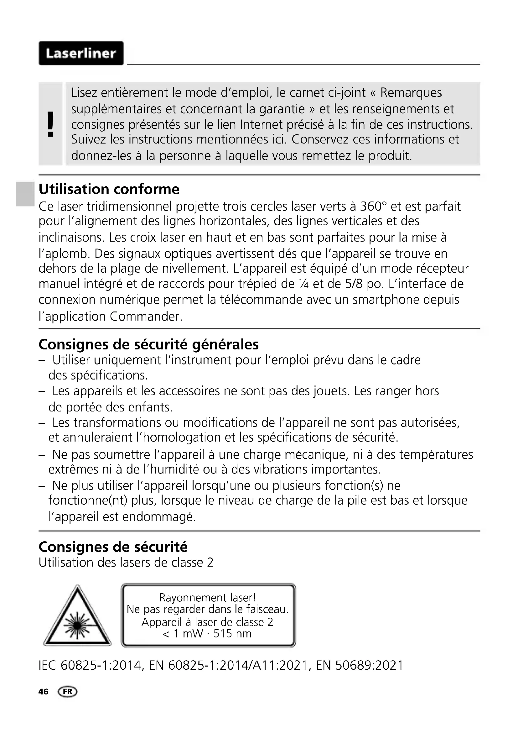Utilisation conforme Ce laser tridimensionnel projette trois cercles laser verts à 360° et est parfait pour l’alignement des lignes horizontales, des lignes verticales et des inclinaisons. Les croix laser en haut et en bas sont parfaites pour la mise à l’aplomb. Des signaux optiques avertissent dés que l’appareil se trouve en dehors de la plage de nivellement. L’appareil est équipé d’un mode récepteur manuel intégré et de raccords pour trépied de¼et de 5/8 po. L’interface de connexion numérique permet la télécommande avec un smartphone depuis l’applicationCommander. Consignes de sécurité générales – Utiliser uniquement l‘instrument pour l‘emploi prévu dans le cadre des spécications. – Les appareils et les accessoires ne sont pas des jouets. Les ranger hors de portée des enfants. – Les transformations ou modications de l’appareil ne sont pas autorisées, et annuleraient l’homologation et les spécications de sécurité. – Ne pas soumettre l’appareil à une charge mécanique, ni à des températures extrêmes ni à de l’humidité ou à des vibrations importantes. – Ne plus utiliser l’appareil lorsqu’une ou plusieurs fonction(s) ne fonctionne(nt) plus, lorsque le niveau de charge de la pile est bas et lorsque l’appareil est endommagé. Consignes de sécurité Utilisation des lasers de classe 2