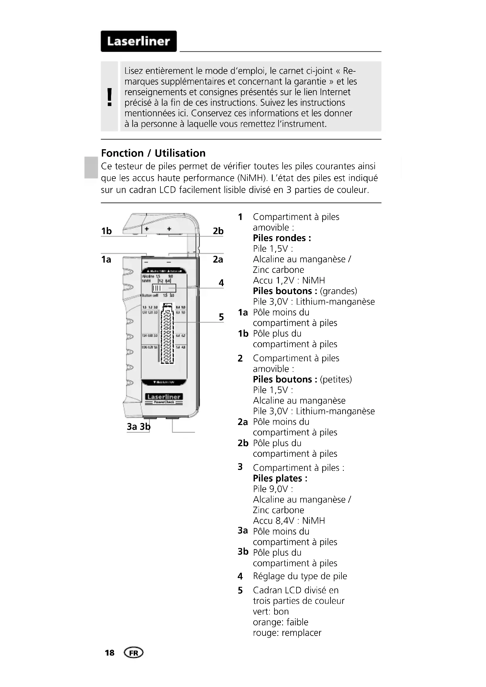 Fonction / Utilisation Ce testeur de piles permet de vérifier toutes les piles courantes ainsi que les accus haute performance (NiMH). L’état des piles est indiqué sur un cadran LCD facilement lisible divisé en 3 parties de couleur. Compartiment à piles amovible : Piles rondes : Pile 1,5V : Alcaline au manganèse / Zinc carbone Accu 1,2V: NiMH Piles boutons : (grandes) Pile 3,0V : Lithium-manganèse Pôle moins du compartiment à piles Pôle plus du compartiment à piles Compartiment à piles amovible : Piles boutons : (petites) Pile 1,5V : Alcaline au manganèse Pile 3,0V : Lithium-manganèse Pôle moins du compartiment à piles Pôle plus du compartiment à piles Compartiment à piles : Piles plates : Pile 9,0V : Alcaline au manganèse / Zinc carbone Accu 8,4V: NiMH Pôle moins du compartiment à piles Pôle plus du compartiment à piles Réglage du type de pile Cadran LCD divisé en trois parties de couleur vert: bon orange: faible rouge: remplacer