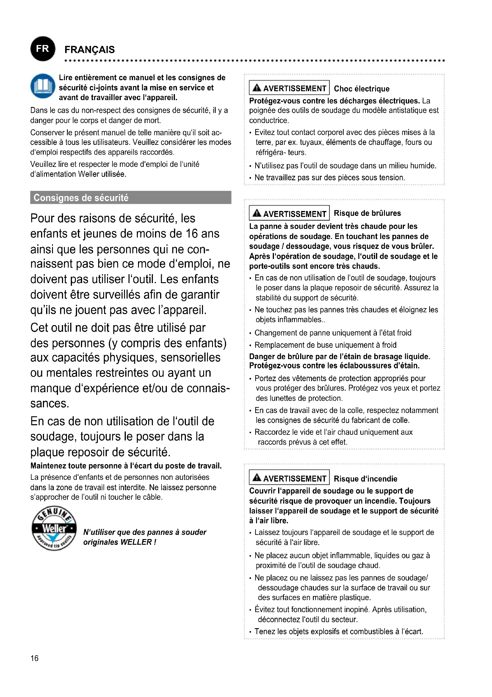 sances. En cas de non utilisation de l‘outil de soudage, toujours le poser dans la plaque reposoir de sécurité. Maintenez toute personne à l‘écart du poste de travail. La présence d‘enfants et de personnes non autorisées dans la zone de travail est interdite. Ne laissez personne s’approcher de l’outil ni toucher le câble. N‘utiliser que des pannes à souder originales WELLER ! AVERTISSEMENT Choc électrique Protégez-vous contre les décharges électriques. La poignée des outils de soudage du modèle antistatique est conductrice.