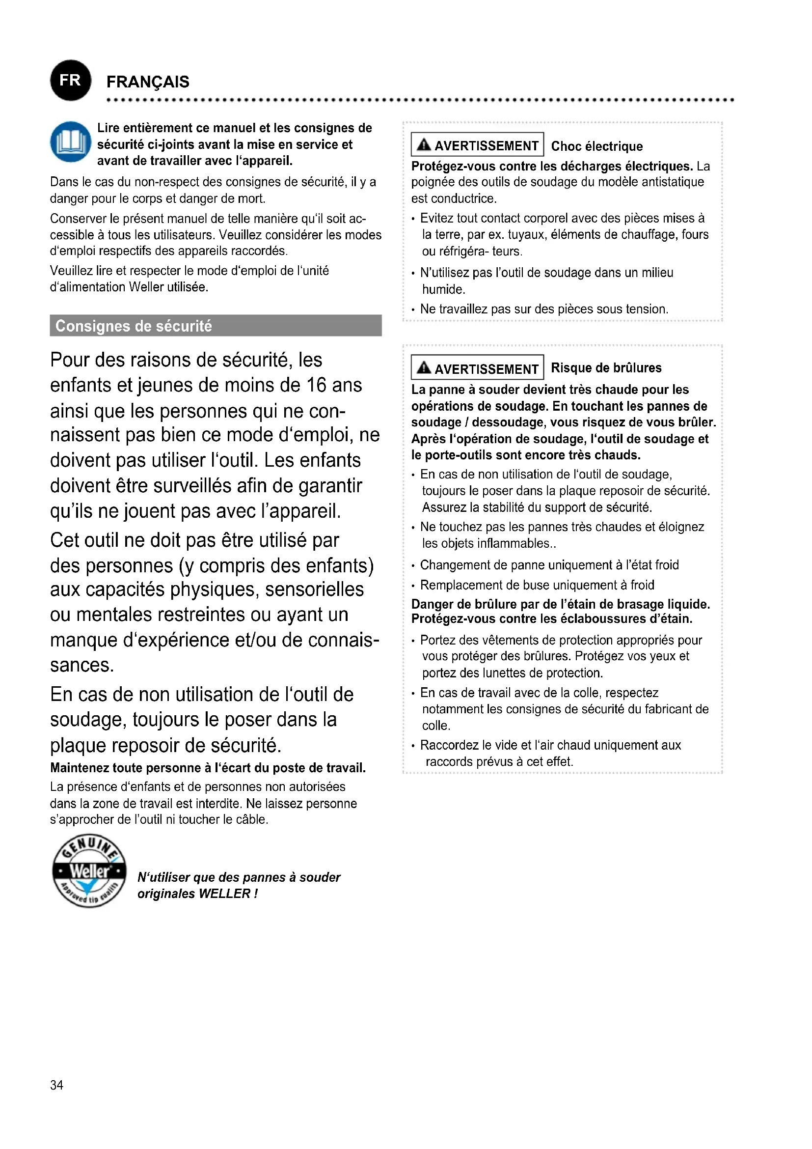 sances. En cas de non utilisation de l‘outil de soudage, toujours le poser dans la plaque reposoir de sécurité. Maintenez toute personne à l‘écart du poste de travail. La présence d‘enfants et de personnes non autorisées dans la zone de travail est interdite. Ne laissez personne s’approcher de l’outil ni toucher le cble. N‘utiliser que des pannes à souder originales WELLER ! AVERTISSEMENT Choc électrique Protégez-vous contre les décharges électriques. La poignée des outils de soudage du modèle antistatique est conductrice.