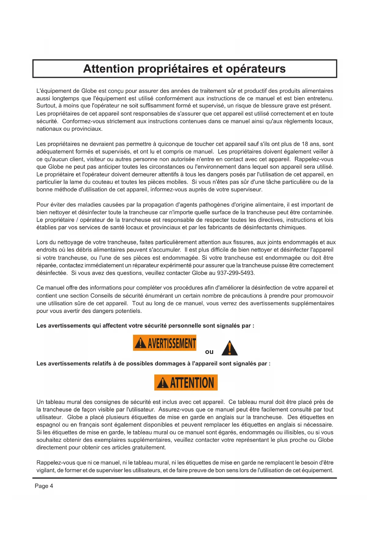 COURRIEL: info@globefoodequip.com SITE WEB : www.globefoodequip.com © Globe Food Equipment Company, 2016 12062012 P/N 980125 Imprimé aux États-Unis ECN 1906 Ver. 1 Rev 5_2016 Table des matièresPage 4 L'équipement de Globe est conçu pour assurer des années de traitement sûr et productif des produits alimentaires aussi longtemps que l'équipement est utilisé conformément aux instructions de ce manuel et est bien entretenu. Surtout, à moins que l'opérateur ne soit sufsamment formé et supervisé, un risque de blessure grave est présent. Les propriétaires de cet appareil sont responsables de s'assurer que cet appareil est utilisé correctement et en toute sécurité. Conformez-vous strictement aux instructions contenues dans ce manuel ainsi qu'aux règlements locaux, nationaux ou provinciaux. Les propriétaires ne devraient pas permettre à quiconque de toucher cet appareil sauf s'ils ont plus de 18 ans, sont adéquatement formés et supervisés, et ont lu et compris ce manuel. Les propriétaires doivent également veiller à ce qu'aucun client, visiteur ou autres personne non autorisée n'entre en contact avec cet appareil. Rappelez-vous que Globe ne peut pas anticiper toutes les circonstances ou l'environnement dans lequel son appareil sera utilisé. Le propriétaire et l'opérateur doivent demeurer attentifs à tous les dangers posés par l'utilisation de cet appareil, en particulier la lame du couteau et toutes les pièces mobiles. Si vous n'êtes pas sûr d'une tâche particulière ou de la bonne méthode d'utilisation de cet appareil, informez-vous auprès de votre superviseur. Pour éviter des maladies causées par la propagation d'agents pathogènes d'origine alimentaire, il est important de bien nettoyer et désinfecter toute la trancheuse car n'importe quelle surface de la trancheuse peut être contaminée. Le propriétaire / opérateur de la trancheuse est responsable de respecter toutes les directives, instructions et lois établies par vos services de santé locaux et provinciaux et par les fabricants de désinfectants chimiques. Lors du nettoyage de votre trancheuse, faites particulièrement attention aux ssures, aux joints endommagés et aux endroits où les débris alimentaires peuvent s'accumuler. Il est plus difcile de bien nettoyer et désinfecter l'appareil si votre trancheuse, ou l'une de ses pièces est endommagée. Si votre trancheuse est endommagée ou doit être réparée, contactez immédiatement un réparateur expérimenté pour assurer que la trancheuse puisse être correctement désinfectée. Si vous avez des questions, veuillez contacter Globe au 937-299-5493. Ce manuel offre des informations pour compléter vos procédures an d'améliorer la désinfection de votre appareil et contient une section Conseils de sécurité énumérant un certain nombre de précautions à prendre pour promouvoir une utilisation sûre de cet appareil. Tout au long de ce manuel, vous verrez des avertissements supplémentaires pour vous avertir des dangers potentiels. Les avertissements qui affectent votre sécurité personnelle sont signalés par : Les avertissements relatifs à de possibles dommages à l'appareil sont signalés par : Un tableau mural des consignes de sécurité est inclus avec cet appareil. Ce tableau mural doit être placé près de la trancheuse de façon visible par l'utilisateur. Assurez-vous que ce manuel peut être facilement consulté par tout utilisateur. Globe a placé plusieurs étiquettes de mise en garde en anglais sur la trancheuse. Des étiquettes en espagnol ou en français sont également disponibles et peuvent remplacer les étiquettes en anglais si nécessaire. Si les étiquettes de mise en garde, le tableau mural ou ce manuel sont égarés, endommagés ou illisibles, ou si vous souhaitez obtenir des exemplaires supplémentaires, veuillez contacter votre représentant le plus proche ou Globe directement pour obtenir ces articles gratuitement. Rappelez-vous que ni ce manuel, ni le tableau mural, ni les étiquettes de mise en garde ne remplacent le besoin d'être vigilant, de former et de superviser les utilisateurs, et de faire preuve de bon sens lors de l'utilisation de cet équipement.