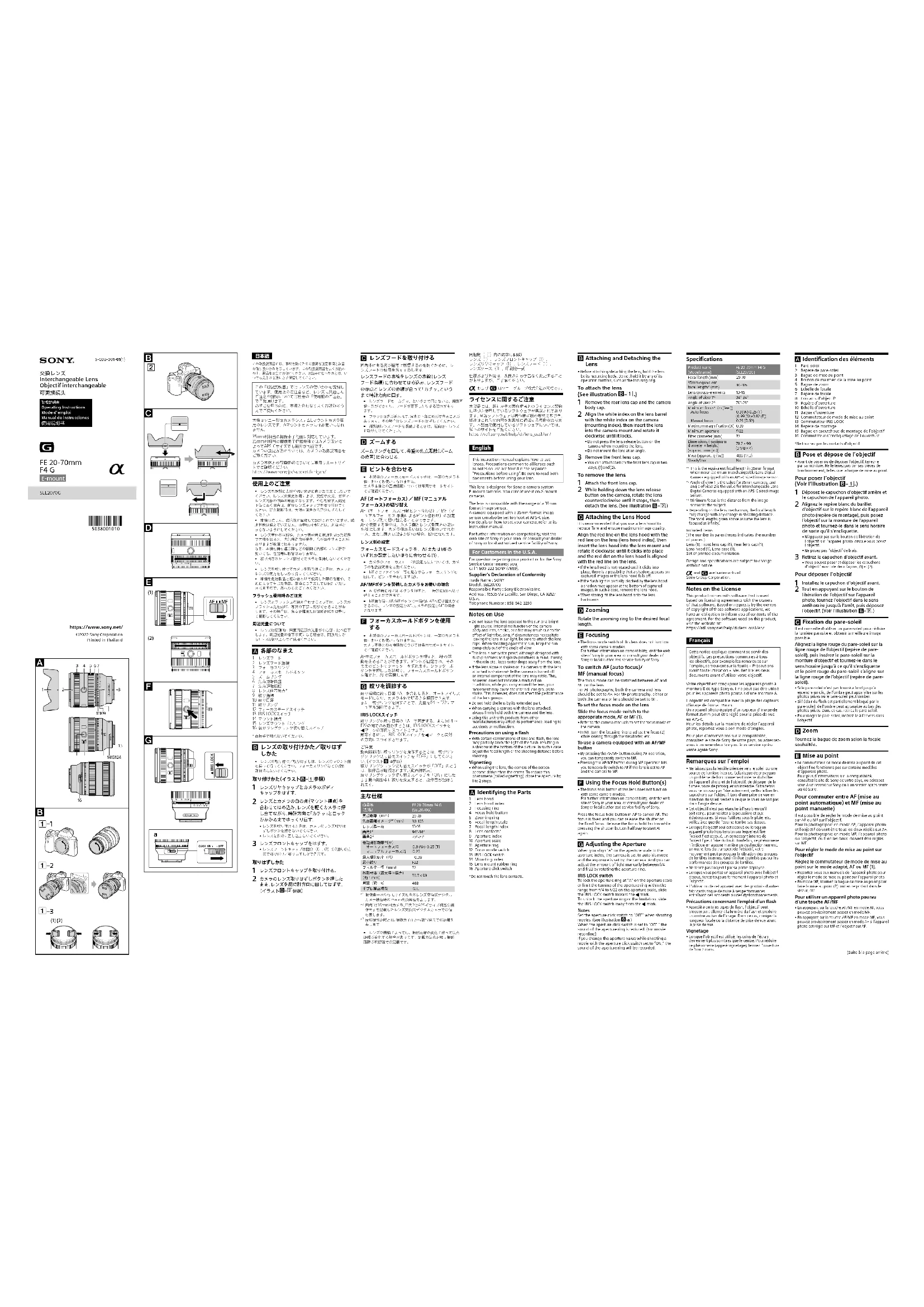 Minimum focus is the distance from the image sensor to the subject.• Depending on the lens mechanism, the focal length may change with any change in shooting distance. The focal lengths given above assume the lens is focused at infinity.Included items (The number in parentheses indicates the number of pieces.)Lens (1), Front lens cap (1), Rear lens cap (1), Lens hood (1), Lens case (1), Set of printed documentationDesign and specifications are subject to change without notice. and are trademarks of Sony Group Corporation. Notes on the License This product comes with software that is used based on licensing agreements with the owners of that software. Based on requests by the owners of copyright of these software applications, we have an obligation to inform you of contents of the agreement. For the software used on this product, visit the website at:https://rd1.sony.net/help/di/lens_oss1/en/Cette notice explique comment se servir des objectifs. Les précautions communes à tous les objectifs, par exemple les remarques sur l’emploi, se trouvent sur la feuille « Précautions avant toute utilisation ». Veuillez lire les deux documents avant d’utiliser votre objectif.Votre objectif est conçu pour les appareils photo à monture E de type Sony α. Il ne peut pas être utilisé pour les appareils photo pourvus d’une monture A.L’objectif est compatible avec la plage des capteurs d’image de format 35mm.Un appareil photo équipé d’un capteur d’image de format 35mm peut être réglé pour la prise de vue en APS-C.Pour les détails sur la manière de régler l’appareil photo, reportez-vous à son mode d’emploi.Pour plus d’informations sur la compatibilité, consultez le site de Sony de votre pays, ou adressez-vous à un revendeur Sony ou à un service après-vente agréé Sony. Remarques sur l’emploi