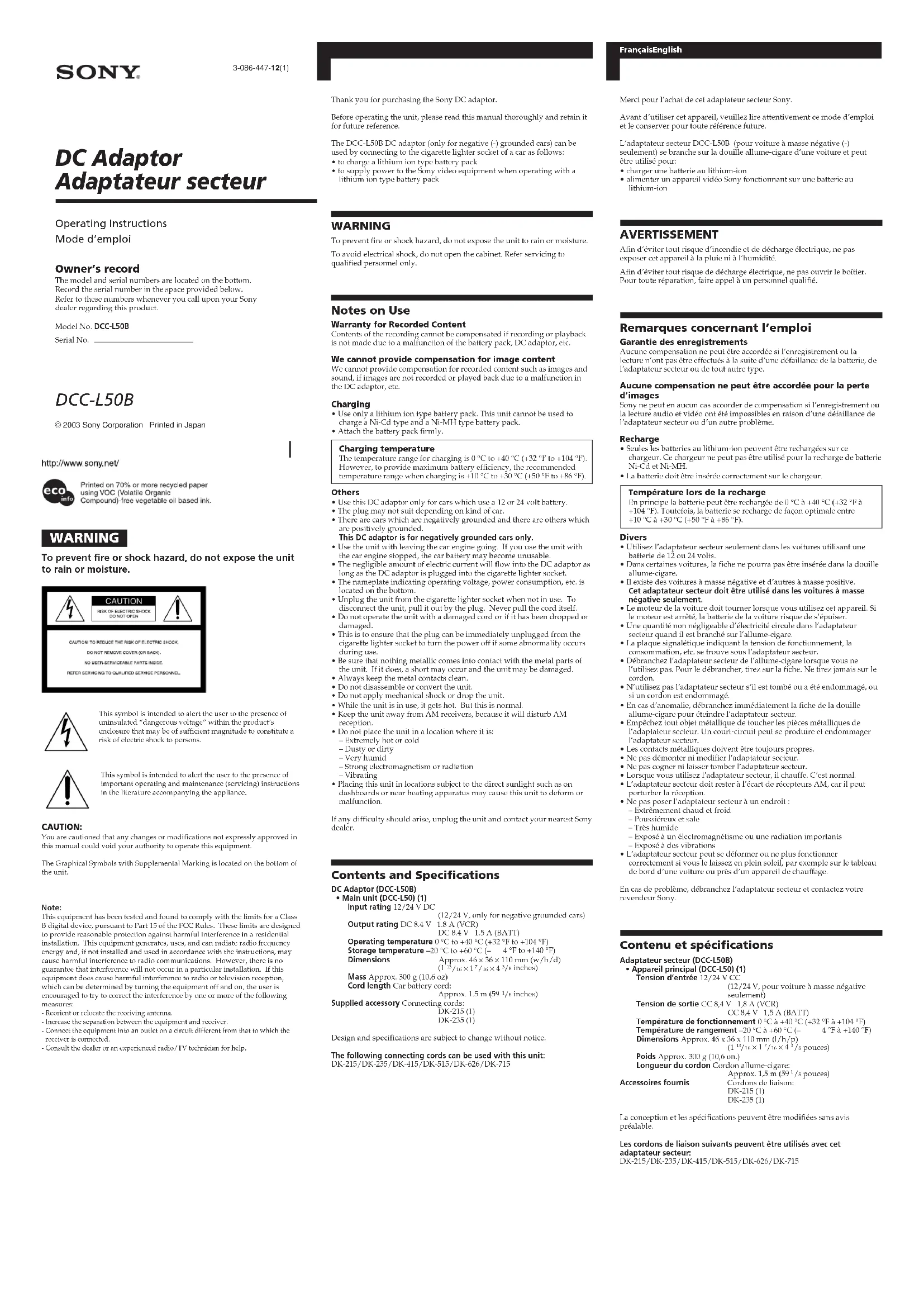 /16 × 1 /16 × 4 /8 inches)Mass Approx. 300 g (10.6 oz)Cord length Car battery cord:Approx. 1.5 m (59 /8 inches)Supplied accessory Connecting cords:DK-215 (1)DK-235 (1)Design and specifications are subject to change without notice.The following connecting cords can be used with this unit:DK-215/DK-235/DK-415/DK-515/DK-626/DK-715 WARNING To prevent fire or shock hazard, do not expose the unit to rain or moisture. This symbol is intended to alert the user to the presence ofuninsulated “dangerous voltage” within the product’senclosure that may be of sufficient magnitude to constitute arisk of electric shock to persons.This symbol is intended to alert the user to the presence ofimportant operating and maintenance (servicing) instructionsin the literature accompanying the appliance.CAUTION:You are cautioned that any changes or modifications not expressly approved inthis manual could void your authority to operate this equipment.The Graphical Symbols with Supplemental Marking is located on the bottom ofthe unit.3-086-447-12(1) DCC-L50B Operating Instructions Mode d’emploi Owner’s record The model and serial numbers are located on the bottom.Record the serial number in the space provided below.Refer to these numbers whenever you call upon your Sonydealer regarding this product.Model No. DCC-L50BSerial No.© 2003 Sony Corporation Printed in Japan DC Adaptor Adaptateur secteur Note:This equipment has been tested and found to comply with the limits for a ClassB digital device, pursuant to Part 15 of the FCC Rules. These limits are designedto provide reasonable protection against harmful interference in a residentialinstallation. This equipment generates, uses, and can radiate radio frequencyenergy and, if not installed and used in accordance with the instructions, maycause harmful interference to radio communications. However, there is noguarantee that interference will not occur in a particular installation. If thisequipment does cause harmful interference to radio or television reception,which can be determined by turning the equipment off and on, the user isencouraged to try to correct the interference by one or more of the followingmeasures: - Reorient or relocate the receiving antenna. - Increase the separation between the equipment and receiver. - Connect the equipment into an outlet on a circuit different from that to which the receiver is connected. - Consult the dealer or an experienced radio/TV technician for help. Merci pour l’achat de cet adaptateur secteur Sony.Avant d’utiliser cet appareil, veuillez lire attentivement ce mode d’emploiet le conserver pour toute référence future.L’adaptateur secteur DCC-L50B (pour voiture à masse négative (-)seulement) se branche sur la douille allume-cigare d’une voiture et peutêtre utilisé pour:• charger une batterie au lithium-ion• alimenter un appareil vidéo Sony fonctionnant sur une batterie aulithium-ion AVERTISSEMENT Afin d’éviter tout risque d’incendie et de décharge électrique, ne pasexposer cet appareil à la pluie ni à l’humidité.Afin d’éviter tout risque de décharge électrique, ne pas ouvrir le boîtier.Pour toute réparation, faire appel à un personnel qualifié. Remarques concernant l’emploi Garantie des enregistrementsAucune compensation ne peut être accordée si l’enregistrement ou lalecture n’ont pas être effectués à la suite d’une défaillance de la batterie, del’adaptateur secteur ou de tout autre type.Aucune compensation ne peut être accordée pour la perted’imagesSony ne peut en aucun cas accorder de compensation si l’enregistrement oula lecture audio et vidéo ont été impossibles en raison d’une défaillance del’adaptateur secteur ou d’un autre problème.Recharge• Seules les batteries au lithium-ion peuvent être rechargées sur cechargeur. Ce chargeur ne peut pas être utilisé pour la recharge de batterieNi-Cd et Ni-MH.• La batterie doit être insérée correctement sur le chargeur.Température lors de la rechargeEn principe la batterie peut être rechargée de 0 °C à +40 °C (+32 °F à+104 °F). Toutefois, la batterie se recharge de façon optimale entre+10 °C à +30 °C (+50 °F à +86 °F).Divers• Utilisez l’adaptateur secteur seulement dans les voitures utilisant unebatterie de 12 ou 24 volts.• Dans certaines voitures, la fiche ne pourra pas être insérée dans la douilleallume-cigare.• Il existe des voitures à masse négative et d’autres à masse positive.Cet adaptateur secteur doit être utilisé dans les voitures à massenégative seulement.• Le moteur de la voiture doit tourner lorsque vous utilisez cet appareil. Sile moteur est arrêté, la batterie de la voiture risque de s’épuiser.• Une quantité non négligeable d’électricité circule dans l’adaptateursecteur quand il est branché sur l’allume-cigare.• La plaque signalétique indiquant la tension de fonctionnement, laconsommation, etc. se trouve sous l’adaptateur secteur.• Débranchez l’adaptateur secteur de l’allume-cigare lorsque vous nel’utilisez pas. Pour le débrancher, tirez sur la fiche. Ne tirez jamais sur lecordon.• N’utilisez pas l’adaptateur secteur s’il est tombé ou a été endommagé, ousi un cordon est endommagé.• En cas d’anomalie, débranchez immédiatement la fiche de la douilleallume-cigare pour éteindre l’adaptateur secteur.• Empêchez tout objet métallique de toucher les pièces métalliques del’adaptateur secteur. Un court-circuit peut se produire et endommagerl’adaptateur secteur.• Les contacts métalliques doivent être toujours propres.• Ne pas démonter ni modifier l’adaptateur secteur.• Ne pas cogner ni laisser tomber l’adaptateur secteur.• Lorsque vous utilisez l’adaptateur secteur, il chauffe. C’est normal.• L’adaptateur secteur doit rester à l’écart de récepteurs AM, car il peutperturber la réception.• Ne pas poser l’adaptateur secteur à un endroit :– Extrêmemen