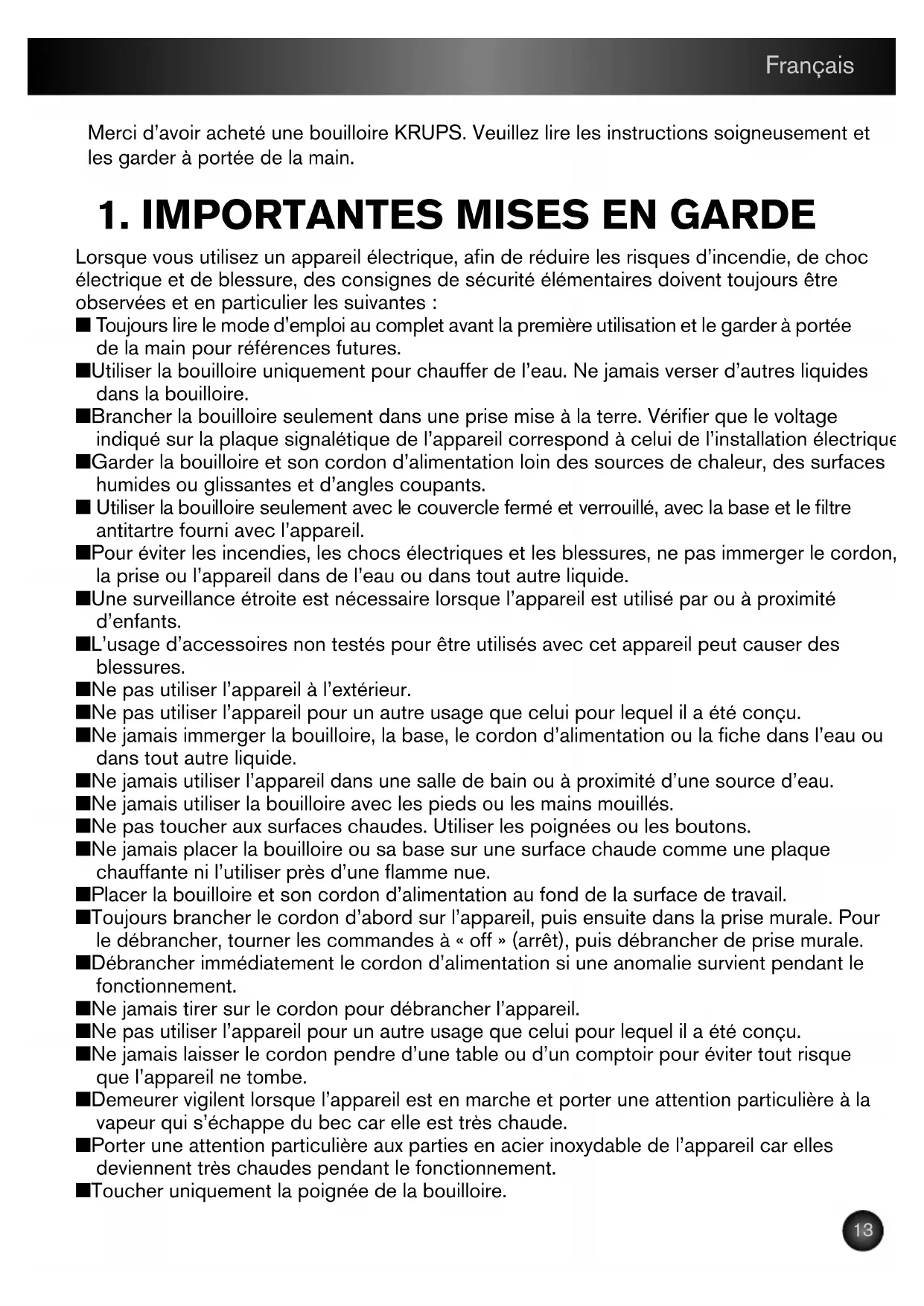 KR_KETTLE_BW730_NAFTA_NC00117831_Mise en page 1 14/02/13 17:07 Page13n Ne jamais laisser les mains ou le cordon d’alimentation sur les parties chaudes de l’appareil. n Ne jamais laisser la bouilloire branchée sur sa base pendant le remplissage, le versage, le nettoyage ou lorsqu’elle est déplacée. n Toujours utiliser le filtre pendant le cycle de chauffe. n Ne jamais toucher le filtre ou le couvercle lorsque l’eau bout. n Ne jamais ouvrir le couvercle lorsque l’eau bout. n Enlever le couvercle pendant le cycle d’infusion peut causer des brûlures. n Ne jamais déplacer la bouilloire lorsqu’elle est en fonctionnement. n Protéger l’appareil de l’humidité et du gel. n Ne jamais utiliser la bouilloire si le cordon ou la prise a été endommagé. Pour éviter tout risque, faire remplacer la partie endommagée dans un centre de service autorisé KRUPS. n Si l’appareil a été endommagé ou s’il ne fonctionne pas correctement, ne pas l’utiliser et ne jamais tenter de le démonter. Il est recommandé de le faire inspecter. n Toute opération autre que le nettoyage et le détartrage effectués en conformité avec les instructions doit être faite par le personnel d’un centre de service agréé KRUPS. n La garantie couvre les défauts de fabrication et une utilisation domestique seulement. Tout bris ou dommage résultant d’un non respect des instructions d’utilisation n’est pas couvert par la garantie. n Tout mauvais branchement annule la garantie. n La garantie ne couvre pas les bouilloires qui fonctionnent mal ou qui ne fonctionnent pas en raison de l’absence de détartrage. n Débrancher l’appareil s’il n’est pas utilisé pendant une période prolongée et au moment de le nettoyer. n Laisser l’appareil refroidir avant d’installer ou d’enlever des accessoires et avant de le nettoyer. n Ne jamais utiliser de tampons abrasifs pour nettoyer l’appareil. n Pour enlever le filtre antitartre, retirer la bouilloire de la base et la laisser refroidir. n Ne jamais enlever le filtre lorsque l’appareil est rempli d’eau chaude. n Ne jamais utiliser une méthode de détartrage autre que celle recommandée. n Tous les appareils sont soumis à un contrôle strict de la qualité. Cela inclut des tests au hasard sur certains appareils, ce qui pourrait expliquer d’éventuelles traces d’utilisation. n Cet appareil n’est pas prévu pour être utilisé par des personnes (y compris les enfants) dénuées d’expérience ou de connaissance, sauf si elles ont pu bénéficier, par l’intermédiaire d’une personne responsable de leur sécurité, d’une surveillance ou d’instructions préalables concernant l’utilisation de l’appareil. n Garder l’appareil hors de la portée des enfants. n Il convient de surveiller les enfants pour qu’ils ne jouent pas avec l’appareil. n Ne jamais utiliser la bouilloire à vide. n Ne jamais remplir la bouilloire au-delà du niveau maximal indiqué, ni sous le niveau minimal indiqué. Si la bouilloire est trop pleine, de l’eau pourrait éclabousser. n Utilisation domestique seulement. n L’utilisation d’accessoires non recommandés par Krups peut causer des incendies, des chocs électriques et des blessures.