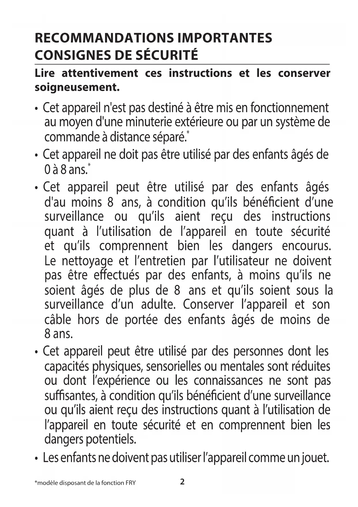 - Les enfants ne doivent pas utiliser l’appareil comme un jouet. *modèle disposant de la fonction FRY3